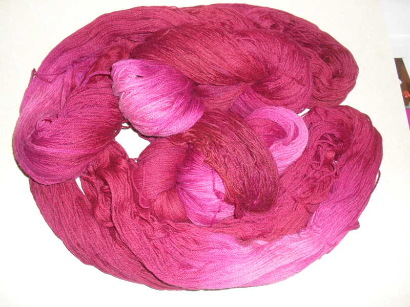 I did end up dunking the lighter end into the dye bath to make sure there were no “blank” spots.  I wish I had done it a bit more I think.  The pinks and reds are wonderfully deep, so for a true semi-solid, there should probably not be such a light spot in the skein.  But I’m pleased with this first effort….as much as a critical artist can be I guess.