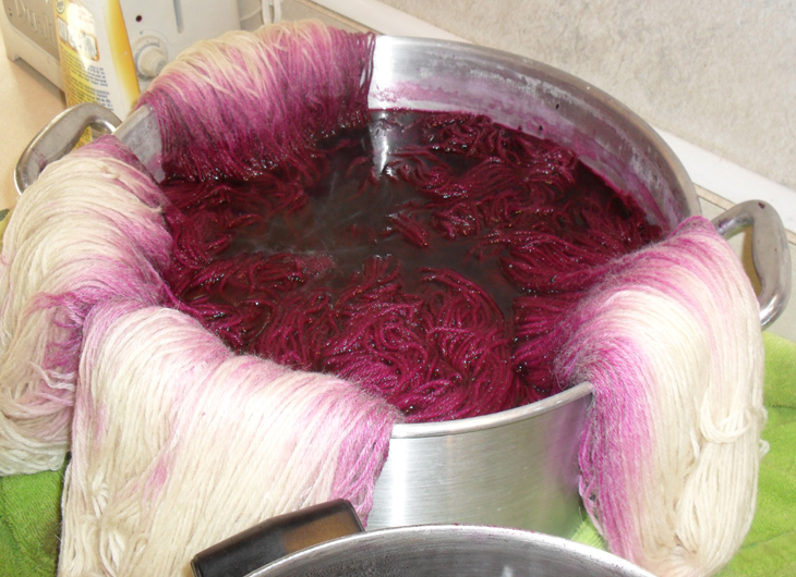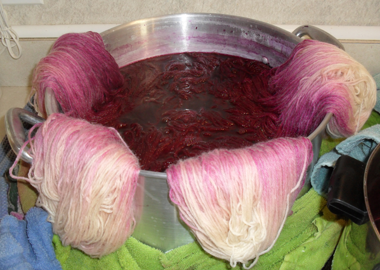 3. Thank you for the tip. I found some pokeberries still left on the bushes (due to all the mild weather we’ve had?) so I over-dyed the ends that I thought were too light. I wetted down half of each skein, put the ends in a dye pot, and gently heated for 10 mins. and left them in for a total of about 15 mins. like you suggested. That took care of it nicely and now there is the more subtle variation that I was looking for.