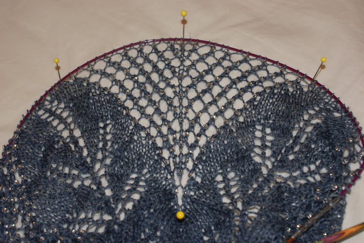 Clue #2 of my In Dreams Mystery Shawl is almost done. This is an amazingly bead-heavy clue – I think Jonica (she is working on two of the things! Holy crap) worked out that there are 912 beads on just this clue. These are worked into triangles that grow in the middle of each repeat of the pattern, slowly taking over the whole row until at the end it will be nothin’ but beads and empty space.