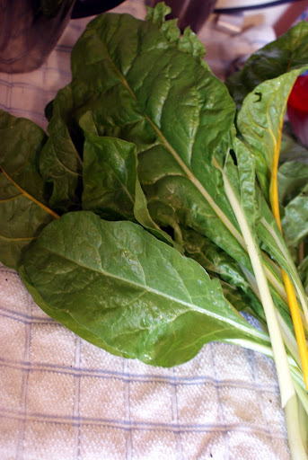The rainbow chard had to be excavated from under the leaning tower of tomatoes, but there was plenty for a wee side dish. I always cook chard with this recipe from Mollie Katzen’s adorable book, The Vegetables I Can’t Live Without. I bought the book, but this is still almost the only recipe I make from it.