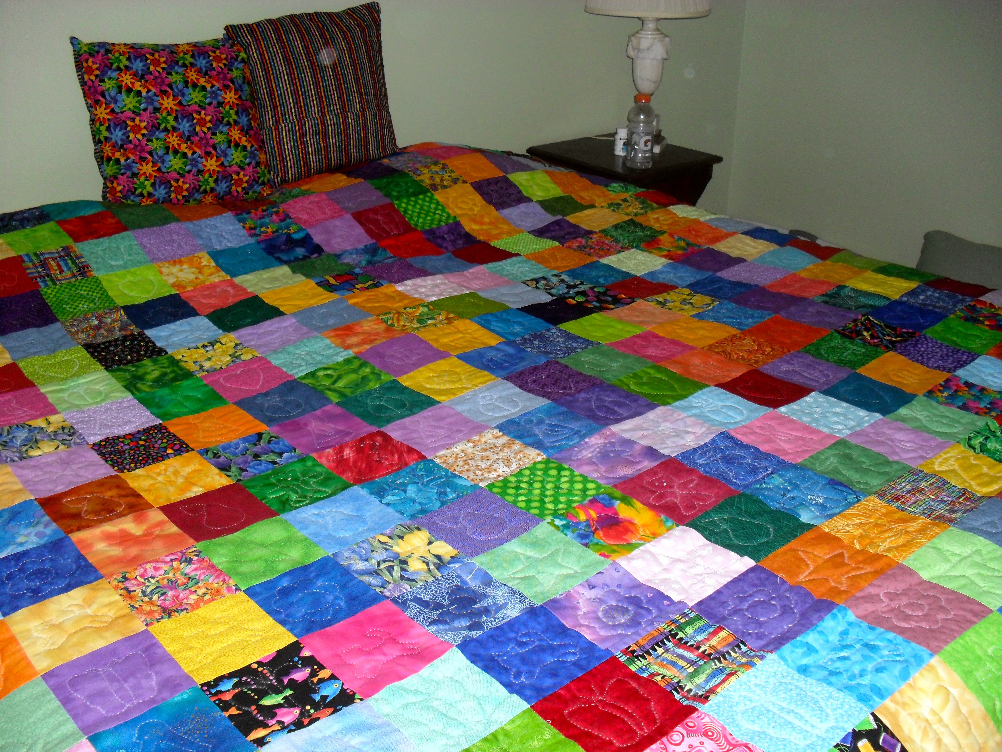 The next day my mom congratulated me too, and she promised to make curtains for the room, for surely no ordinary window treatment was going to work with this quilt. My husband even agreed to put it on our bed, which was another gift to me. I mean it’s bright!! Really bright. Not every husband would agree to that.