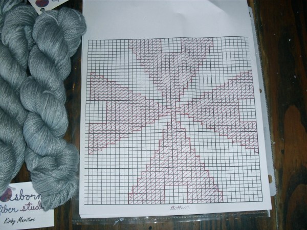 You can see to the right of the Compass Rose cross, some graph paper with an enlarged copy of the cross. This graph paper is knitting graph paper, which knitters can use to make a chart for knitting. It is special in that each graph “square” is not perfectly square, because knit stitches are not the same height as width. “Squares” on knitting graph paper are actually rectangles similar in dimension to the knitted stitch, so anything I draw onto it will be reproduced into knitting in the same dimensions. I’ve made many designs this way, and it’s a fun way to design charts if you are impatient like I am with learning new computer software.