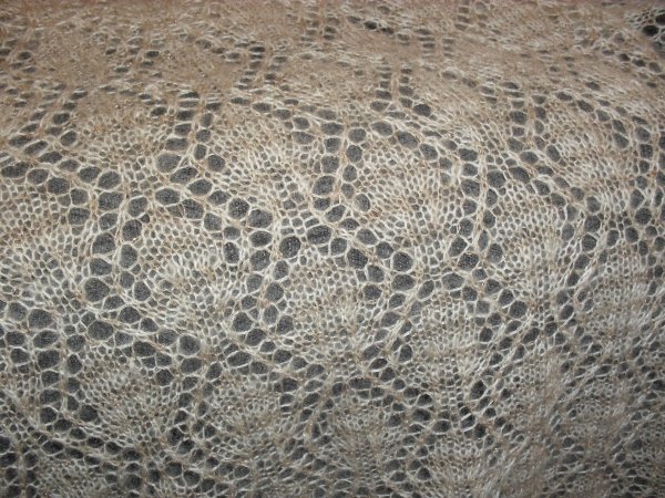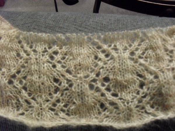 You can see if you look closely that I alternated the yarns every other row. The mohair yarn hid the beads a bit, but in person, the stole still has a lovely shimmer.