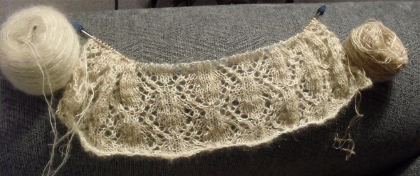 I searched and searched for stole patterns that used only 700 yards, but they were all about 1000-1200 yards. (That’s half the fun of using stash yarn: figuring out the perfect pattern for it.) Gosh, there was a lovely vest-type thing, and a nice sleeveless shirt type thing that used the exact amount of the actual yarn I had! But she didn’t want a vest or shirt; she wanted a stole. So in the end I visited “So Original” in Olney, MD, and the store owner helped me pick out some Debbie Bliss Angle mohair lace and J. Knits lace to go with the Tilli Tomas.