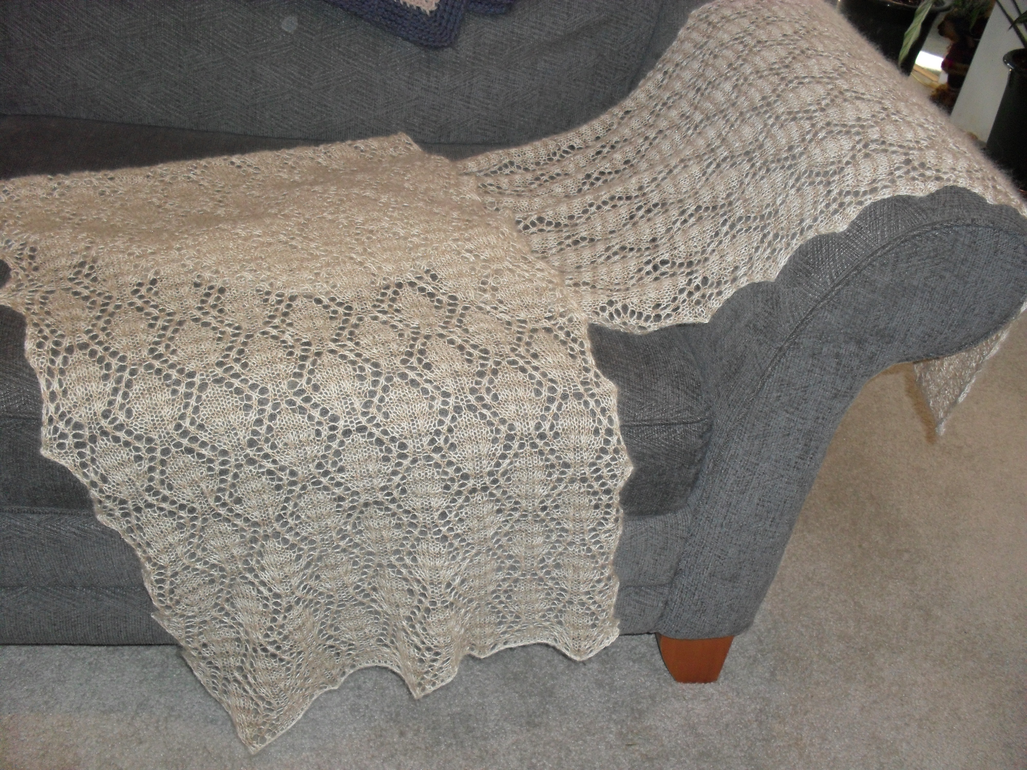 It’s so neat now to page through knitting magazines knowing that I can knit lace! Of course I’m talking about “lace knitting” which according to some means that the complicated bits are only on right side rows, and all wrong side rows are purled. Actual “knitted lace” means complicated row, complicated row, complicated row, complicated row … no relief. Maybe by next Christmas. Anyway, my sister-in-law loves it, and I’m thrilled too.