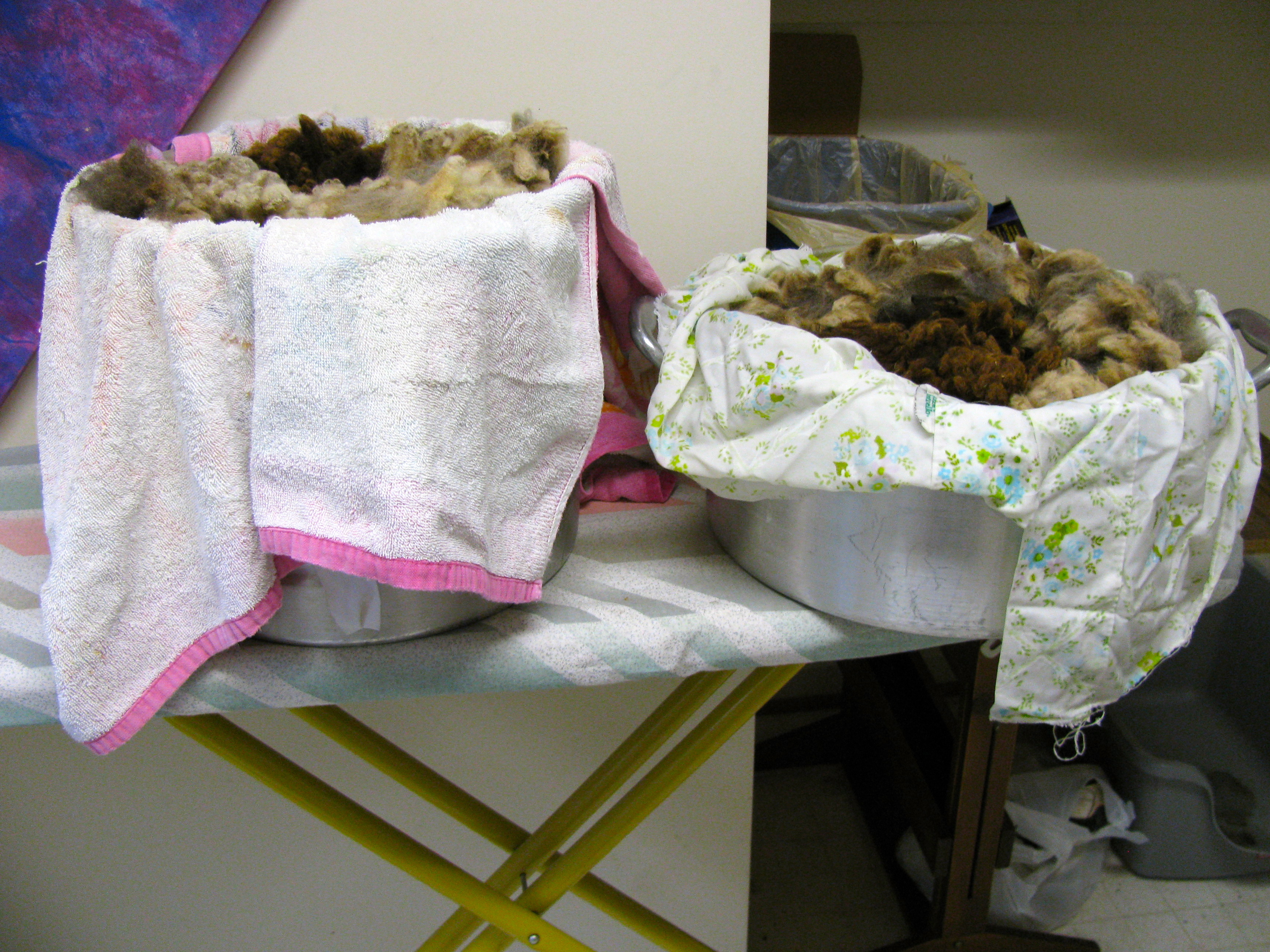 After that, the wool gets dumped gently into 2 towels where I squeeze out excess water.  Then I arrange it on the floor on more dry beach towels.
