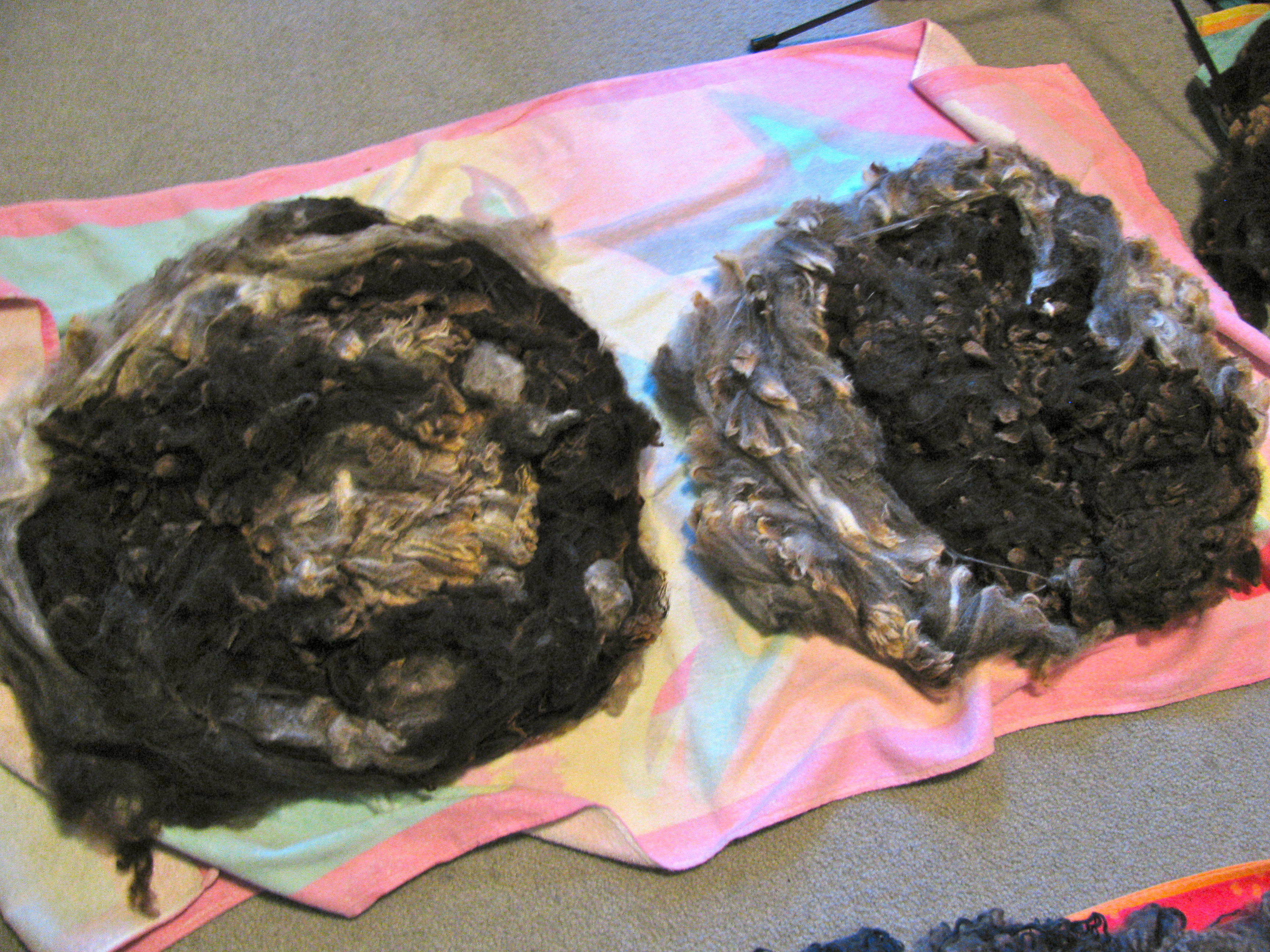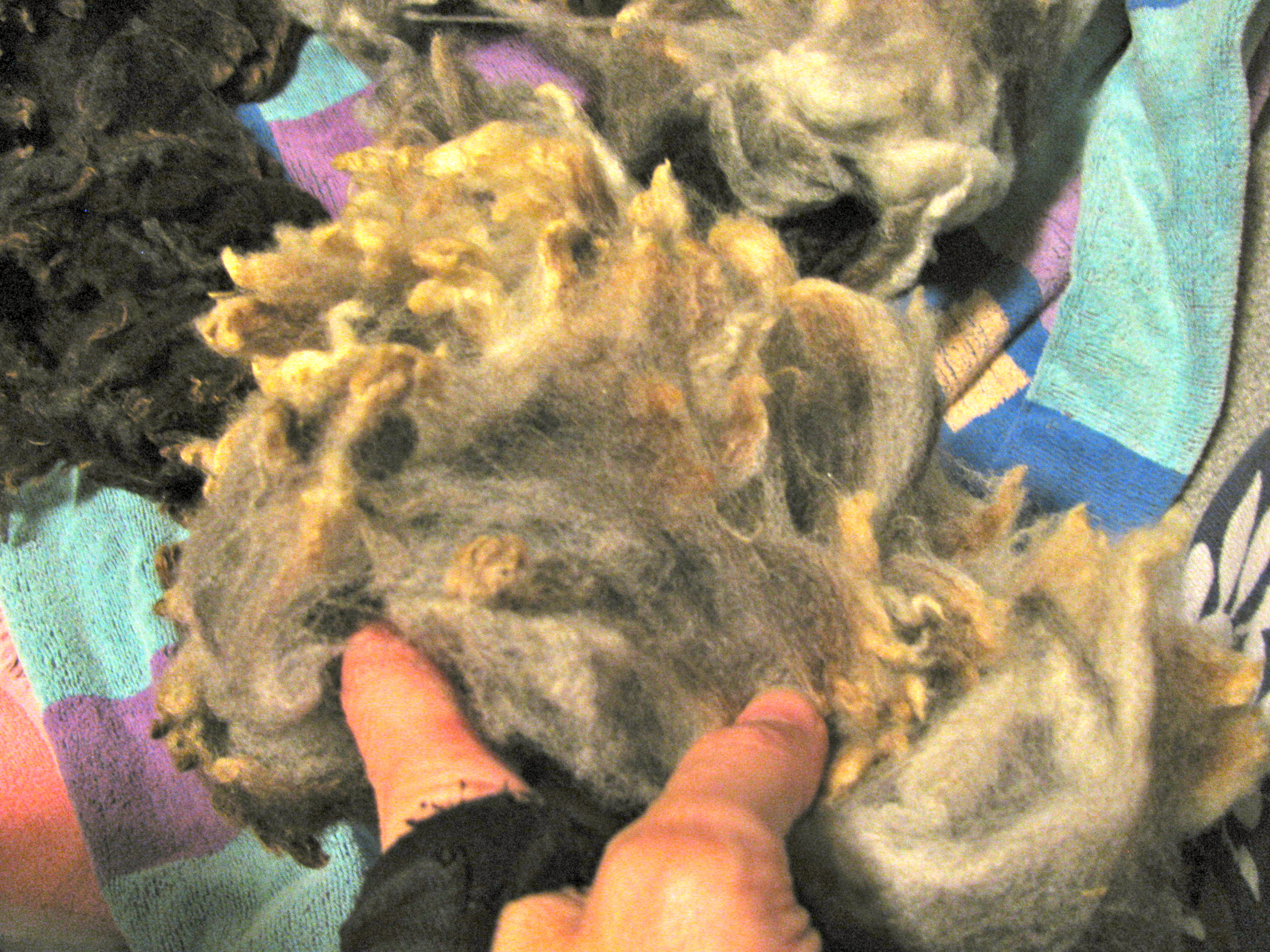 Just for fun, I (Mom) thought I’d tell you what I’m doing with the fleeces I acquired in May.  First, I bought part of a Rupert Corriedale with some new buddies at my spinning class.  Rebecca also gave me half of her her silver, long wool fleece.  Lastly, she and I bought a Cormo cross together and split it.
