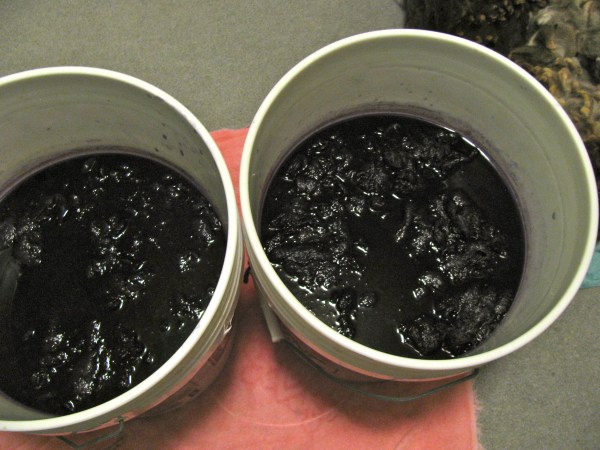 This is actually kinda hard on my stove because I have a flat glass stove and one of my burners doesn’t work right, meaning it doesn’t turn off unless I turn it in a certain direction.  And it only has too settings:  VERY high and low.  Even the low is pretty hot.  I did actually end up boing this fleece once.  In the end I decided that a heating means this:  Turn the broken burner on low and a 2nd working burner on high.  As soon as they get super hot to the touch, turn them both off.  The residual heat from a glass top burner keeps them hot for hours……I mean hours!  It takes half the day to cool them off!  I can only do 2-3 heatings in a day.  Anyway, after 2 heatings with soap and 4 rinses, I finally mordanted the lot in Alum and plopped them in 2 buckets full of black bean dye bath.