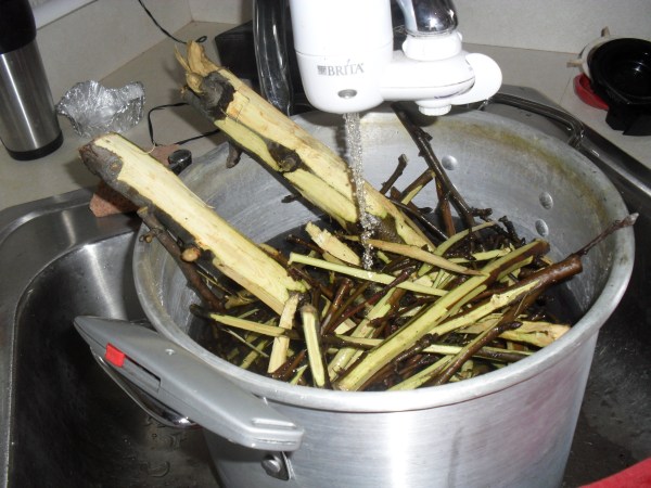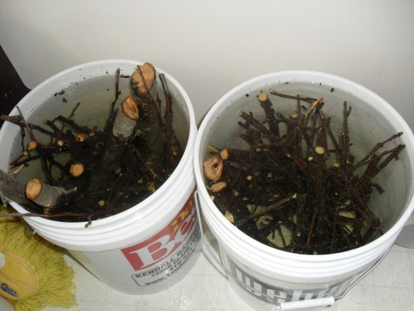 1) Fill a bucket with branches (include leaves if it’s that time of year) to soak for at least 3 days. No more than 6 days or it will get slimy and smelly. This does not hurt the dye color, but it does make it nastier to work with.