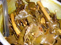 3) Simmer the stripped wood in my dye pot for an hour. Let it cool overnight.