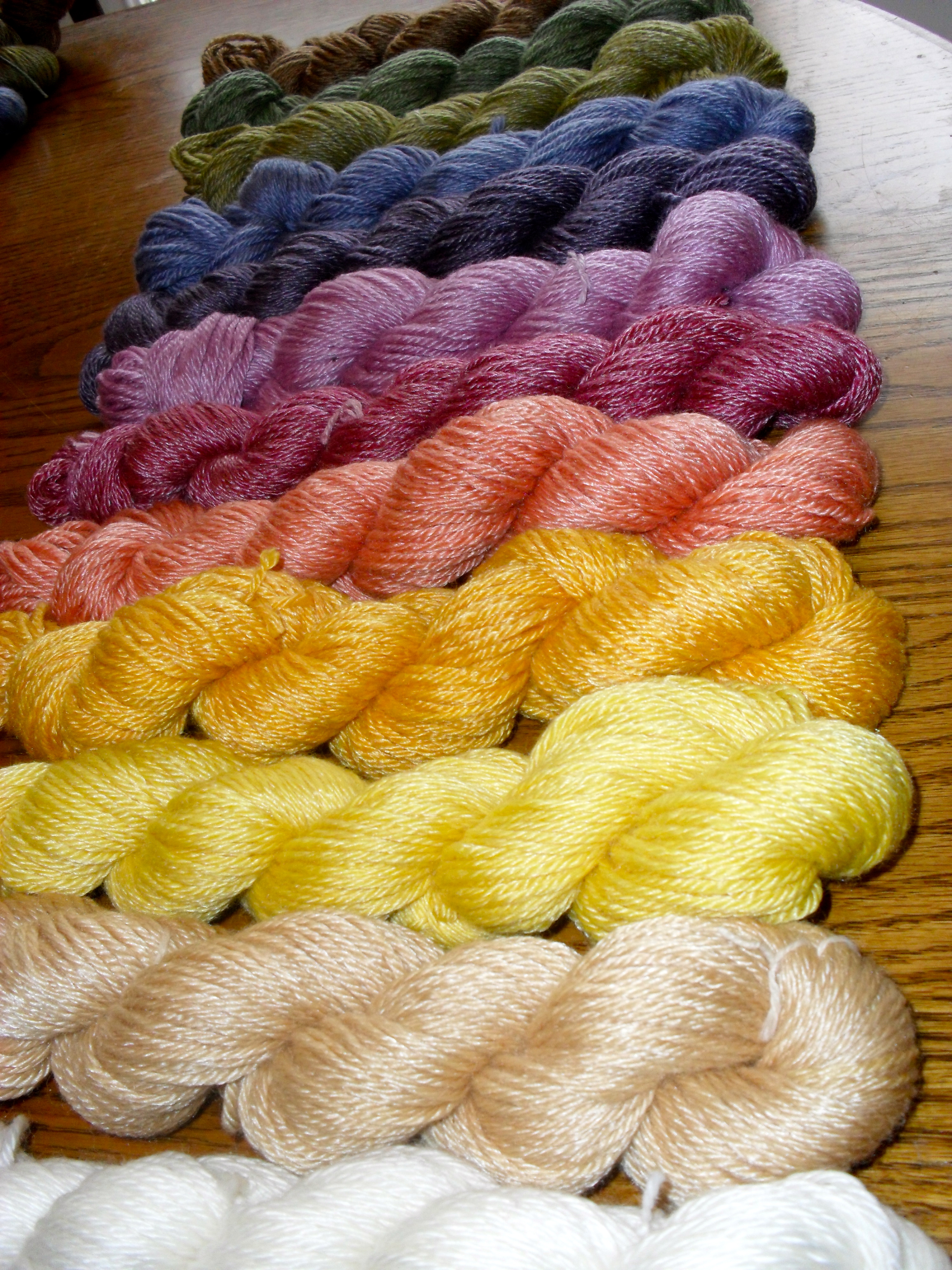 It took me a year of experimenting to get the hang of exactly what to do, because reading all the material I could find did not explain much. My dear husband bought me 8 books on natural dying two Christmases ago, and they got me started. But in the end, one has to DO the thing oneself to “get” it. (If one is lucky. Things I have not managed to master even after reading about them and trying: Running on a regular basis – I always got shin splints and finally took up aerobic dancing instead; Making my mother-of-the-bride dress in a purple lace – I bought an outfit; Getting RED out of madder root – I got a lovely orange only. I could go on, but I won’t. Ick.)