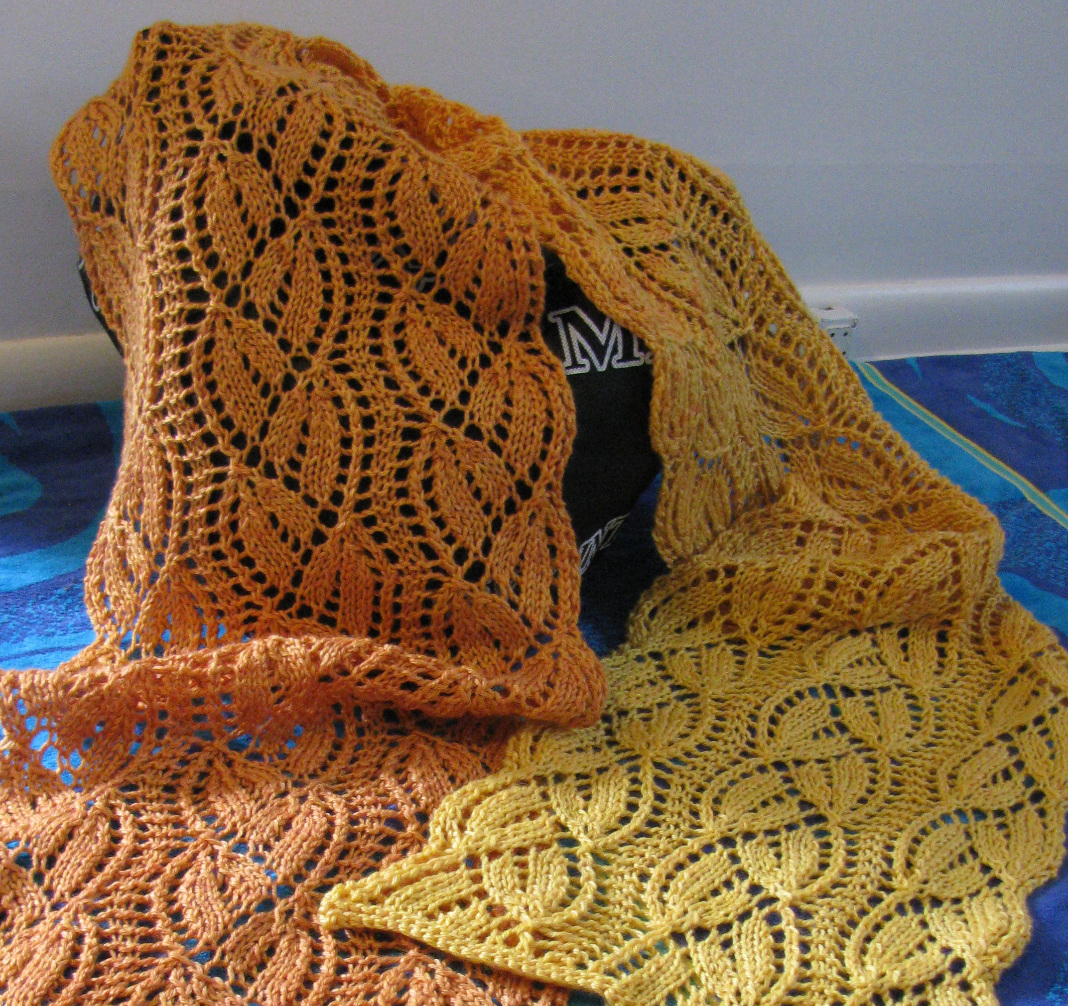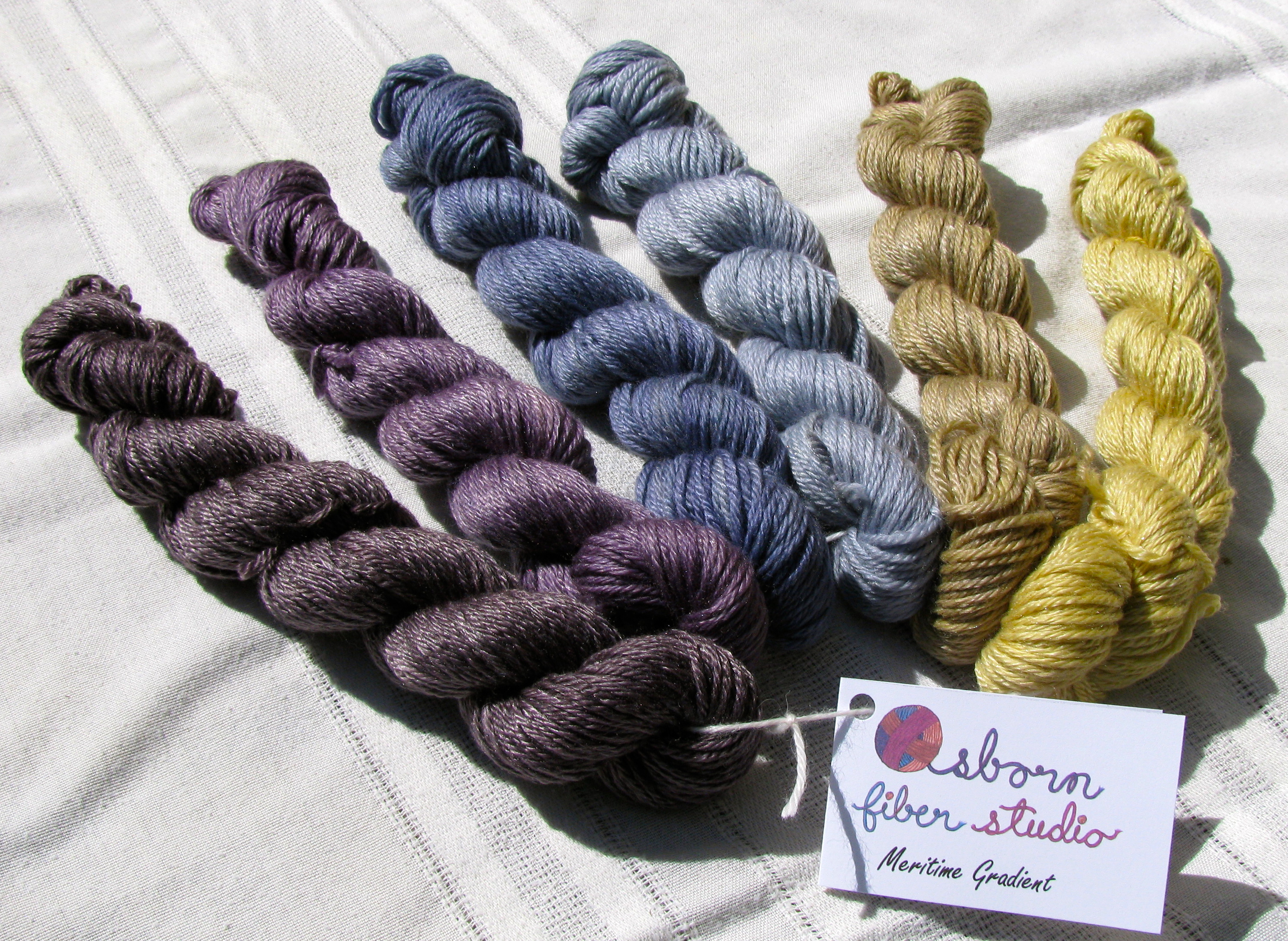 The pattern is free with the purchase of a set of gradients in any color, which is enough to make the scarf. All these yarns (9 color-ways in both Meritime and Woolpaca) are now available from Osborn Fiber Studio, and soon we will set up a “store” on the website for them. If you need 2 or more sets in one color, I will be sure to dye them together so they are in the same lot and match perfectly.