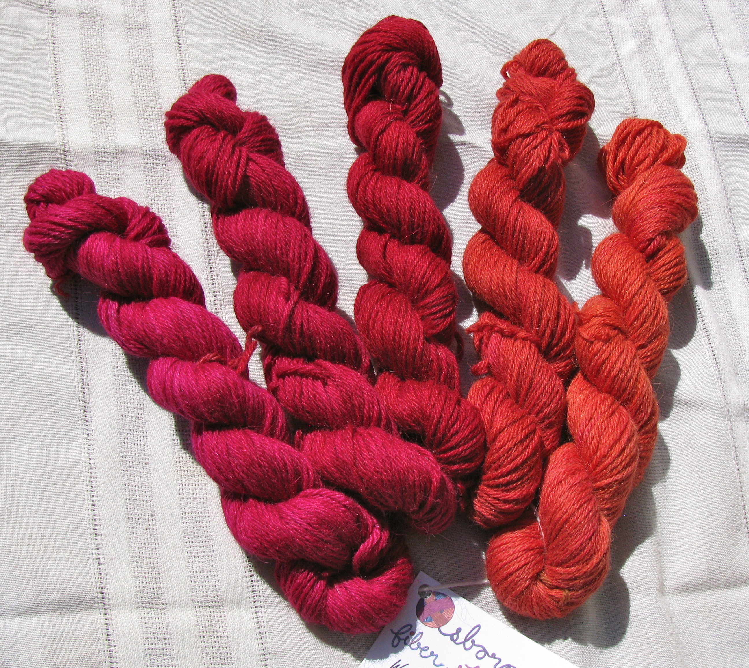 Next, Rebecca asked me to make a gradient set with the Meritime in our Nectar color (shown first). That was challenging because it involves both madder root and turmeric. Though difficult, it made a beautiful color and I was glad I tried it…such a pretty color for the summer I was inspired to make a “Summer Scarf” out of this color for our sample. (see end of post.) We hope Rebecca will eventually design something too! My mom’s favorite color is Peach Orchard, which is the madder root by itself.