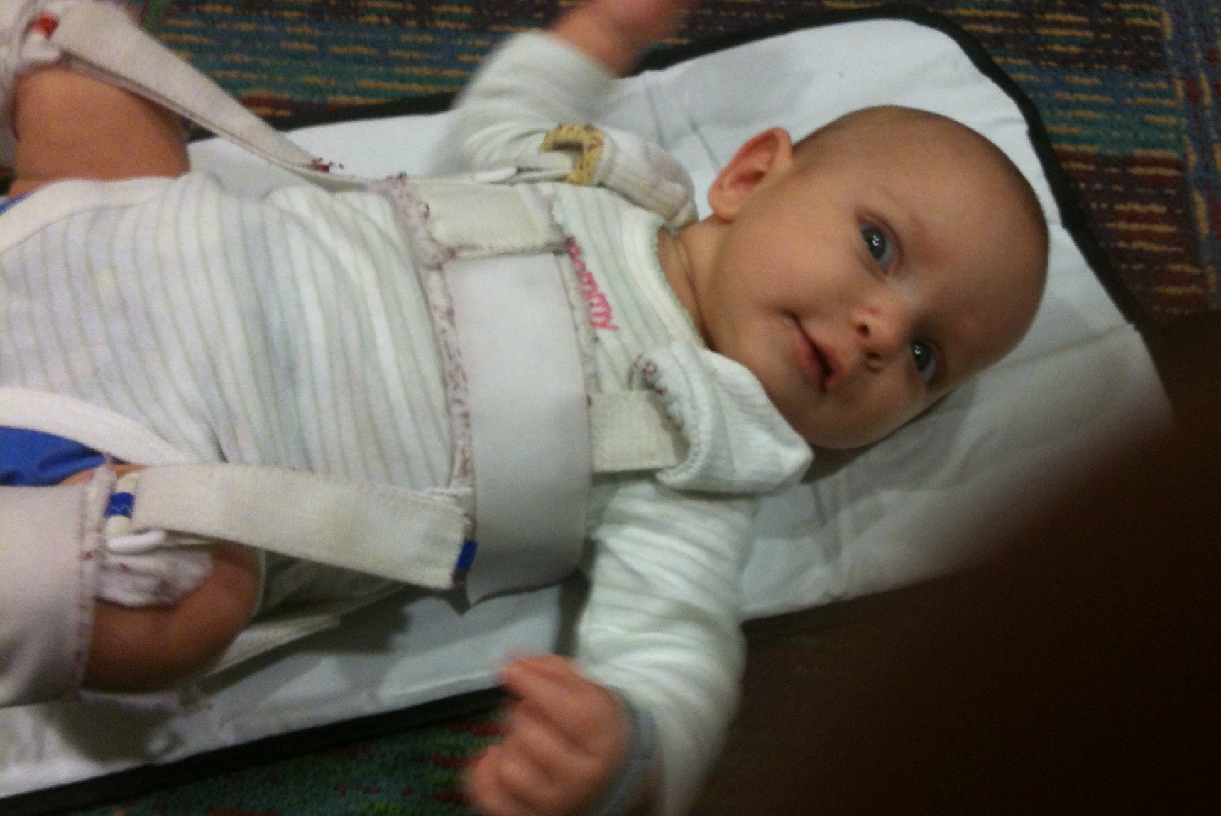 But there’s nothing like sitting outside the orthopedists office to put this short inconvenience in perspective. Most of the kids who go to the orthopedists, or at least this one, had broken limbs or serious birth defects or learning disabilities. Their parents would be coping with these issues for much longer, with a lot more pain, and in some cases for their whole lives. Both they and their kids are freaking heroes for keeping on. As I said, Naomi only had to be in the harness full-time for six weeks, and she will be in it at night for another month. That’s more than half of her precious little life thus far, but a drop in the bucket when place next to all the time she’ll get to spend running and playing as a perfectly normal little girl. Gone unchecked, hip dysplasia can mean a serious limp and major corrective surgery, and worse or later-caught cases than hers mean longer in a harness or even a cast.