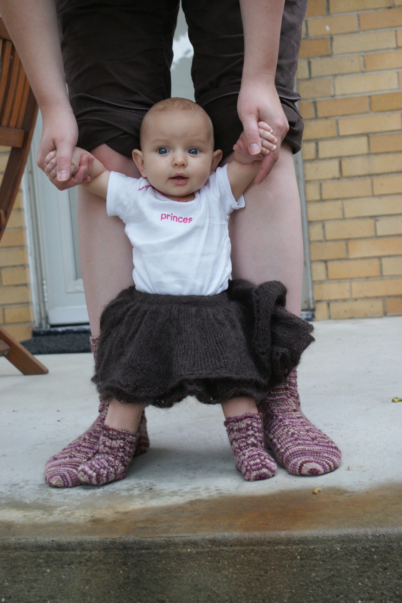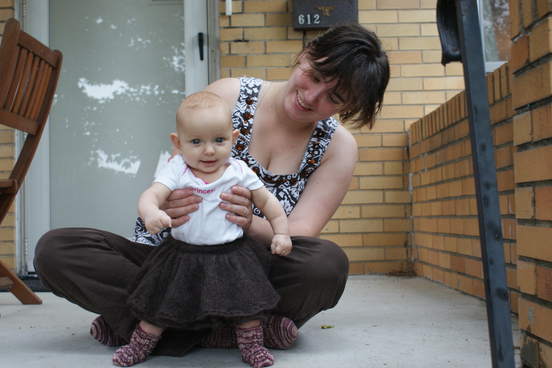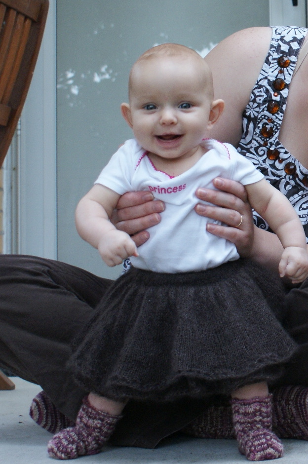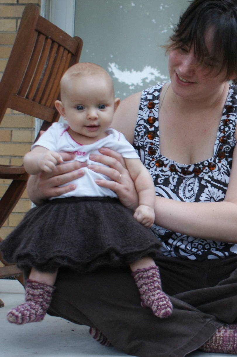 Speaking of outfits, around the same time I finally finished Naomi’s Little Brown Tutu. As predicted, I LOVE it, and she looks aDORBS. Okay, so the original idea was to match the little sweaters that my friends made for her, which she has almost outgrown and which is it too warm now to wear. But the tutu will fit her for a while (I made the elastic waistband easily adjustable), and now I have an excuse to knit her more little rose-colored sweaters! The pattern is Tutu, a very well written thing with sizes from newborn to tween, and several options for pretty hems. It takes an ungodly amount of expensive kid mohair/silk blend yarn, and requires an ungodly amount of very plain knitting, but I still deceive myself that I’ll make more of these as she grows older. How can I not when she looks so cute? (And how many babies can look like champions of girl power in a tutu?)