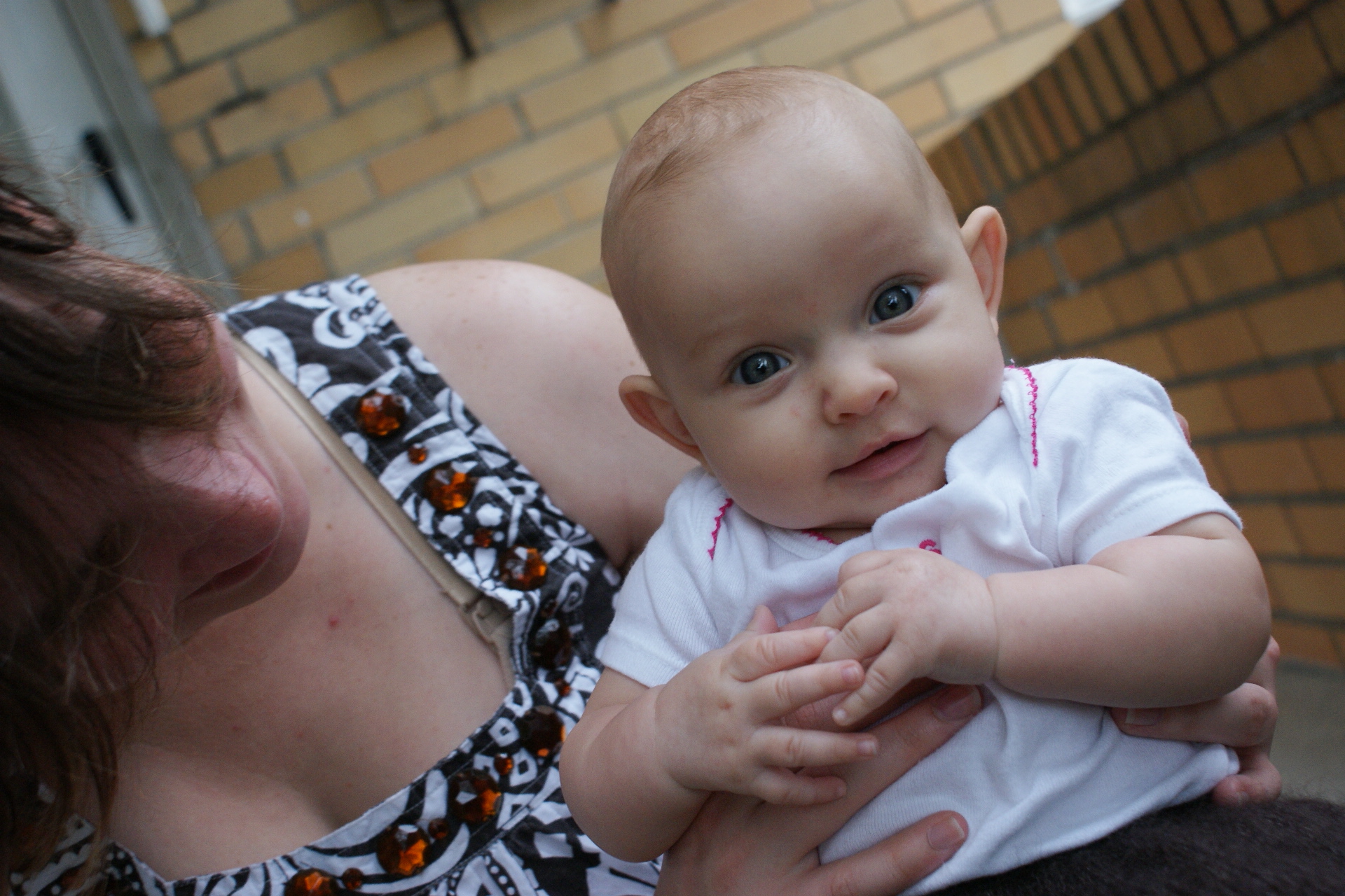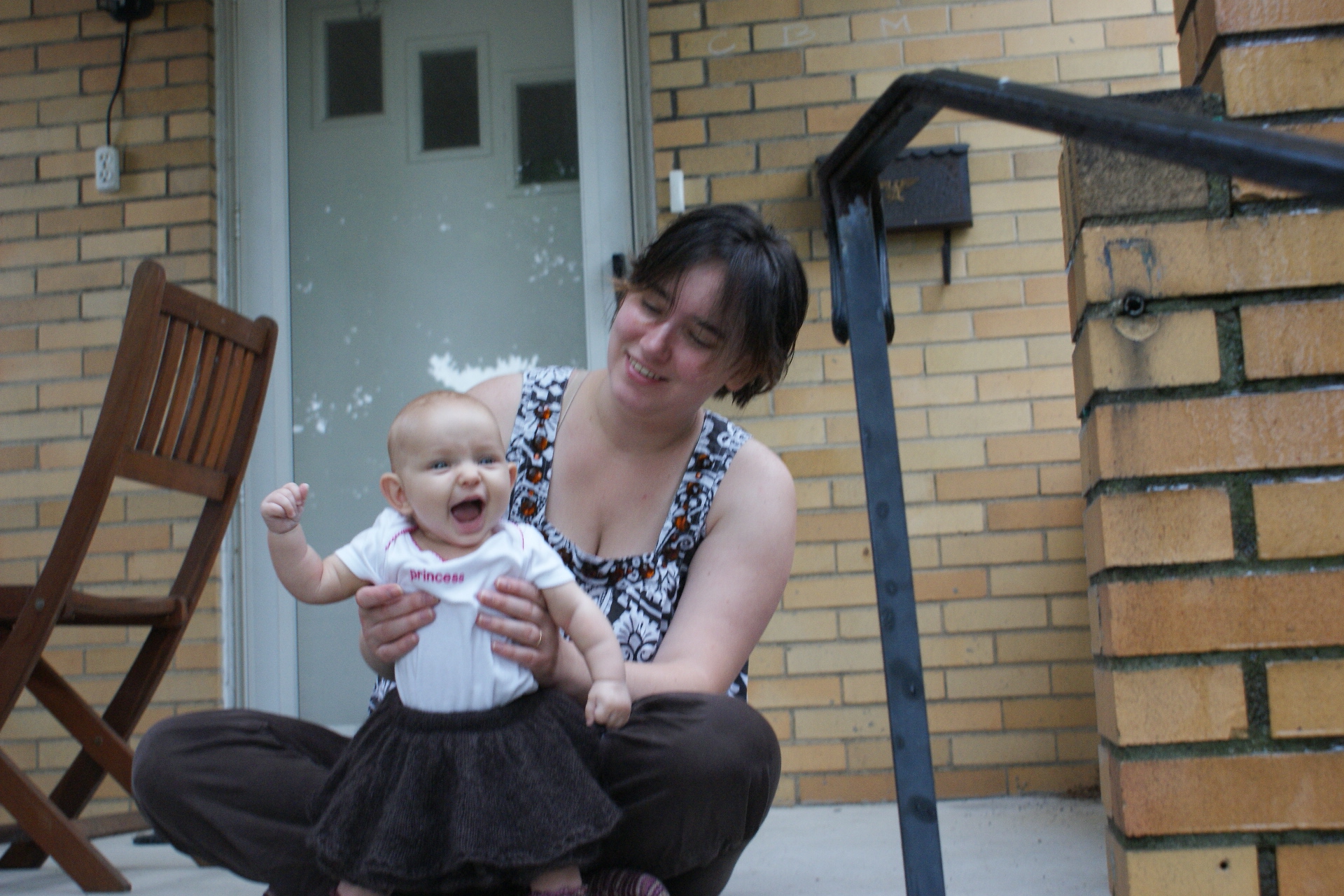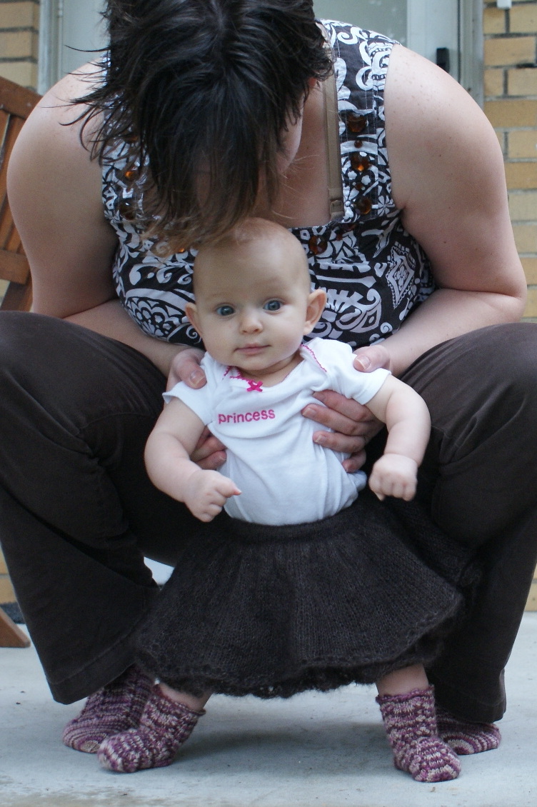 Speaking of outfits, around the same time I finally finished Naomi’s Little Brown Tutu. As predicted, I LOVE it, and she looks aDORBS. Okay, so the original idea was to match the little sweaters that my friends made for her, which she has almost outgrown and which is it too warm now to wear. But the tutu will fit her for a while (I made the elastic waistband easily adjustable), and now I have an excuse to knit her more little rose-colored sweaters! The pattern is Tutu, a very well written thing with sizes from newborn to tween, and several options for pretty hems. It takes an ungodly amount of expensive kid mohair/silk blend yarn, and requires an ungodly amount of very plain knitting, but I still deceive myself that I’ll make more of these as she grows older. How can I not when she looks so cute? (And how many babies can look like champions of girl power in a tutu?)