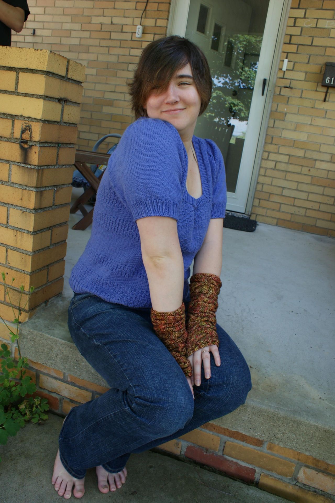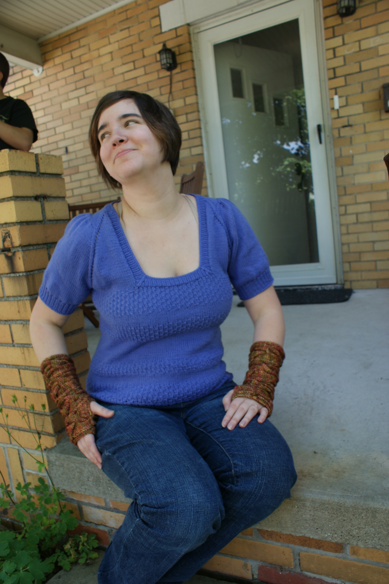 I knit it. It was predictably boring. It was with me through a few books, several moves, and so on. It wasn’t super fun, because the yarn wasn’t very nice to work with. Not quite as bad as Lion Cotton, but in that category of bad. It’s nice to wear and sturdy, but might give you carpal tunnel. So when the summer passed and it still wasn’t finished, it found its way to the bottom of a drawer, where it languished.