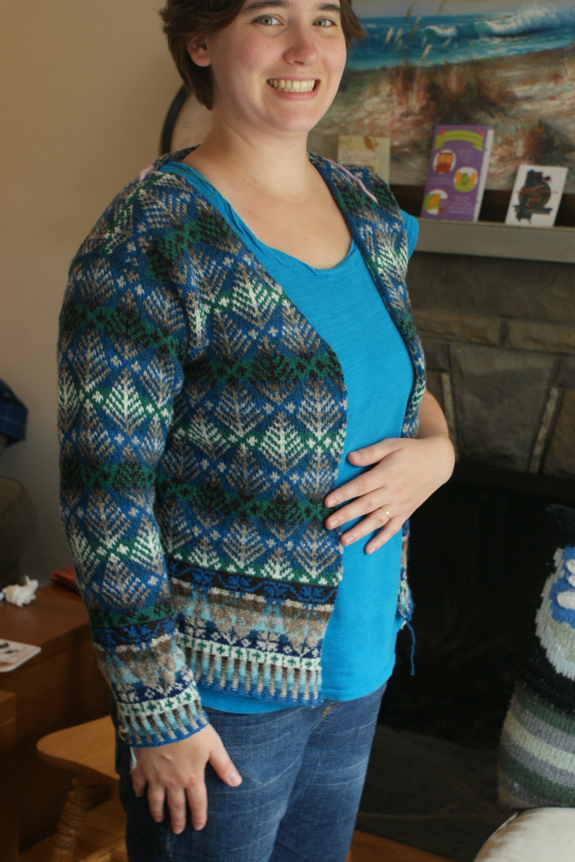 I made it my goal to finish the shawl collar during vacation, and I got close. Just three rows left! Which is at least two hours of work, not including the bind off. I totally redid the ribbing colors, though they follow the same basic light-to-dark foreground and dark-to-light background as the bottom and sleeve edgings. I’m content. My one concern is the pick-up edge; I kinda messed up the whole edge-stitch thing for most of the front steek, so I was picking up in both foreground and background, and it looks a little messy. I’m thinking about just crocheting a chain through the pick-up edge with one of the background colors. thoughts?