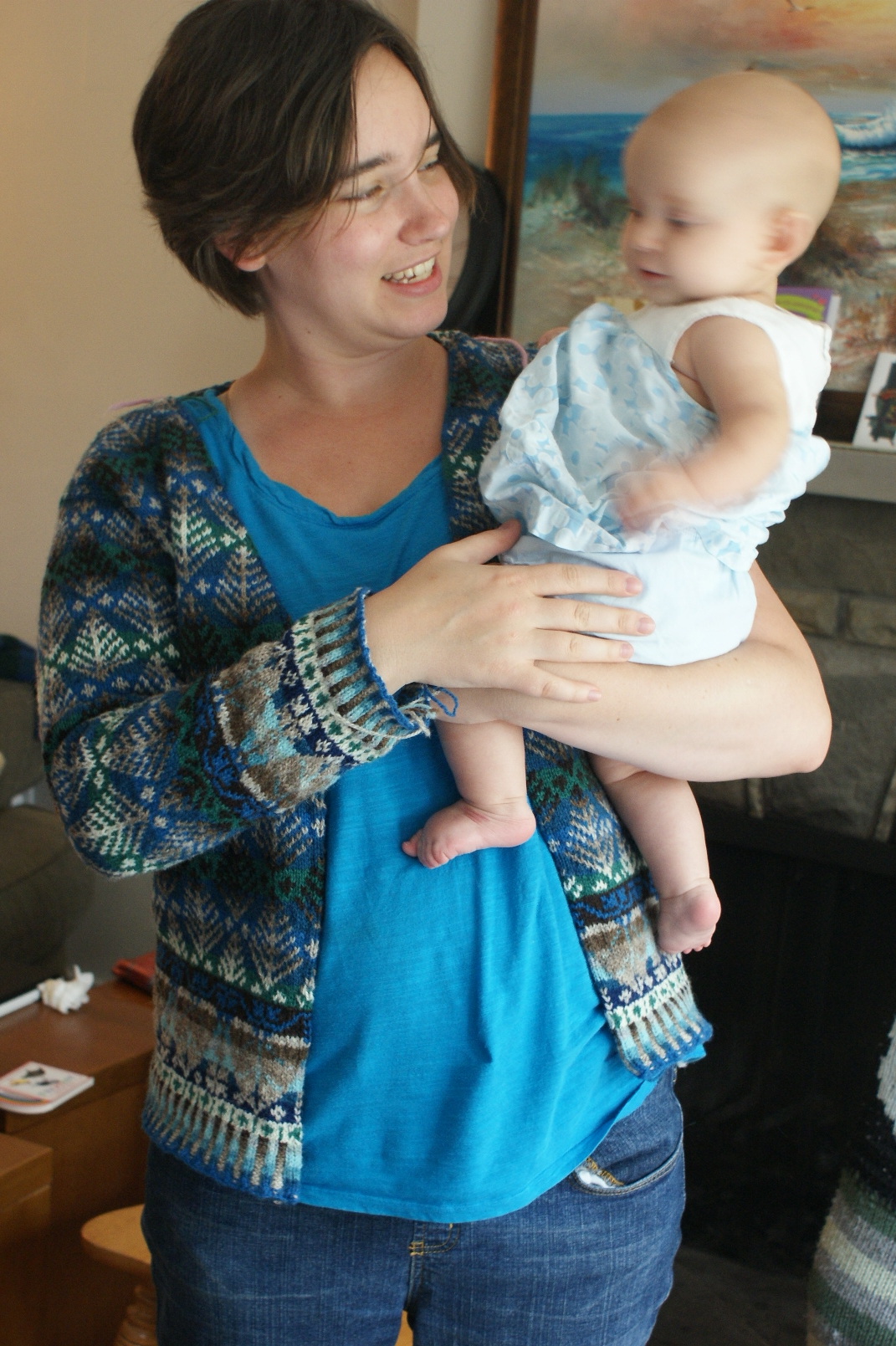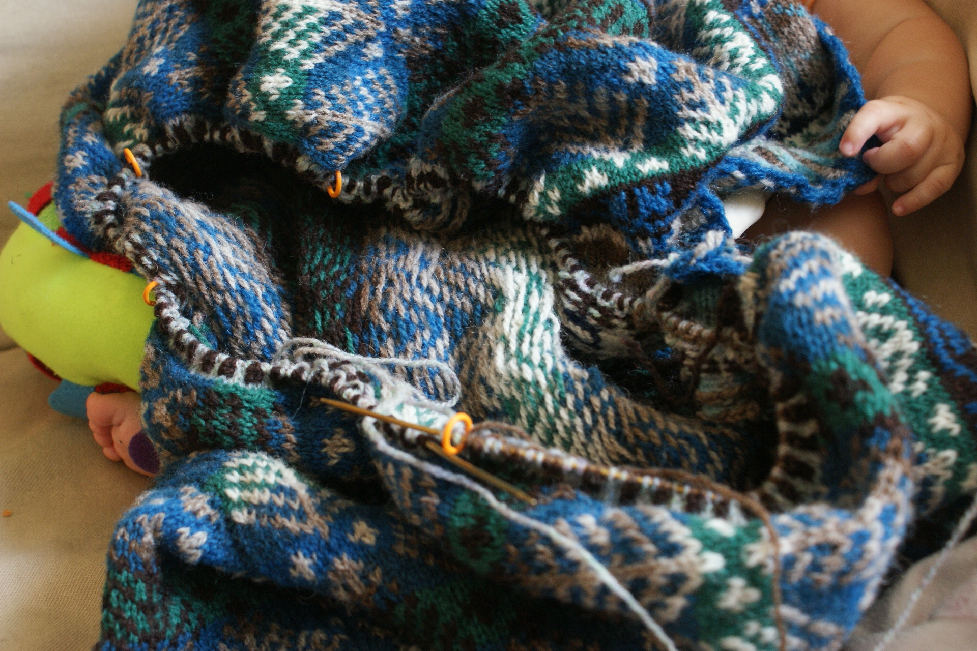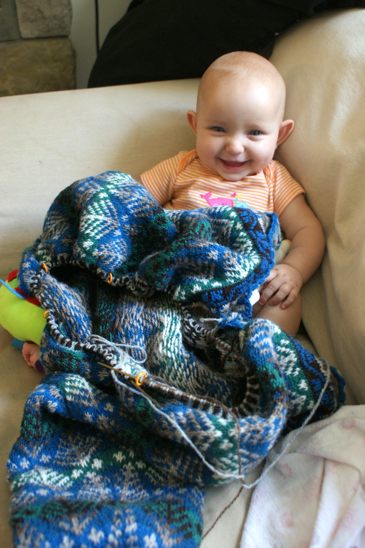 Going out in an unfinished sweater? Nothing covers up a missing sleeve like a five-month-old. No one will even notice. And if they do, they will probably think you are so crazy that they’ll be afraid to say anything.