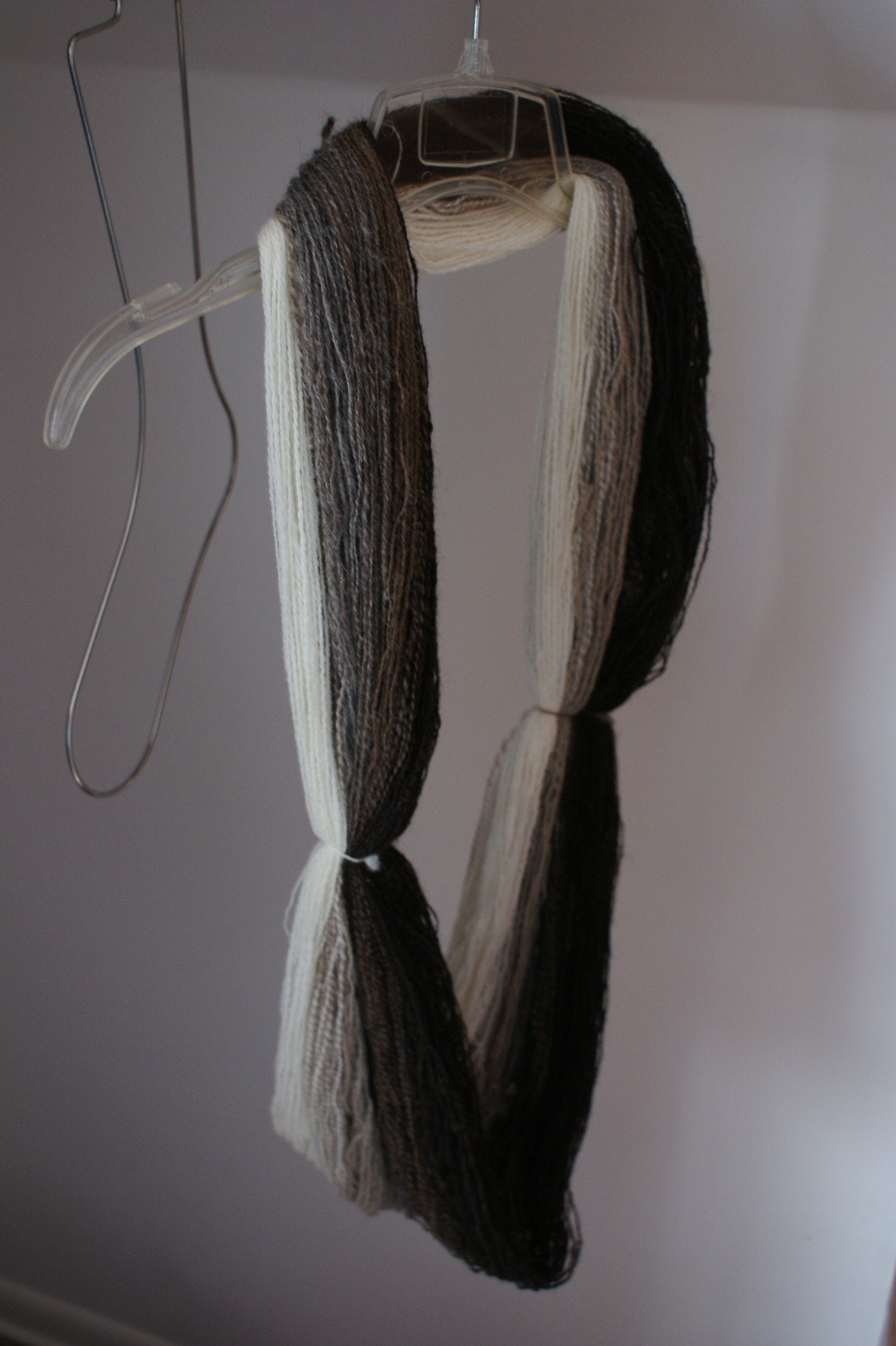 I achieved a gradient by winding each color of singles into a center-pull ball, then alternating between spinning from both ends of the same ball and spinning the last of one ball with the beginning of the next. So the color switches back and forth between a marled blend and a solid, with an extra-long patch of white and black solid at the two ends.