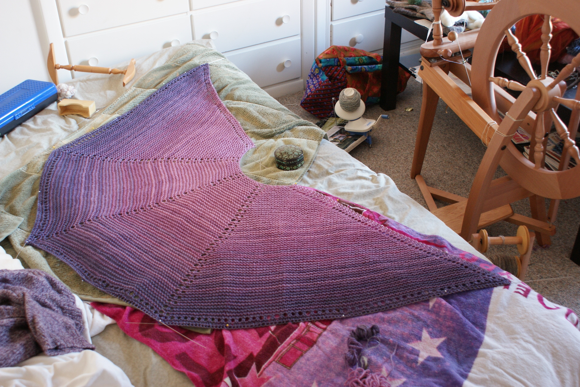 Scroll down to see a gradience version of the Weaver’s Wool Mini Shawl. (The original pattern is by Peggy Pignato. The pattern below was reconstructed without a pattern, as it was unavailable at the time of writing.)