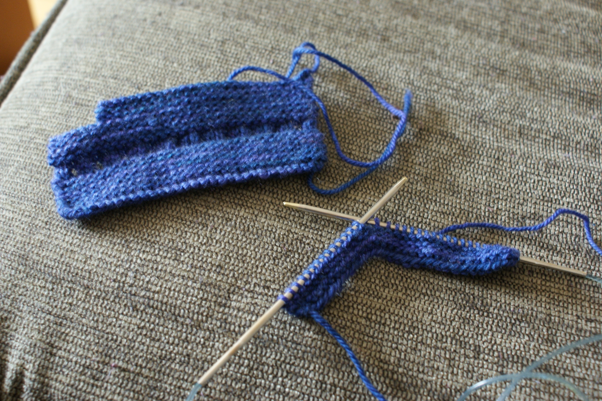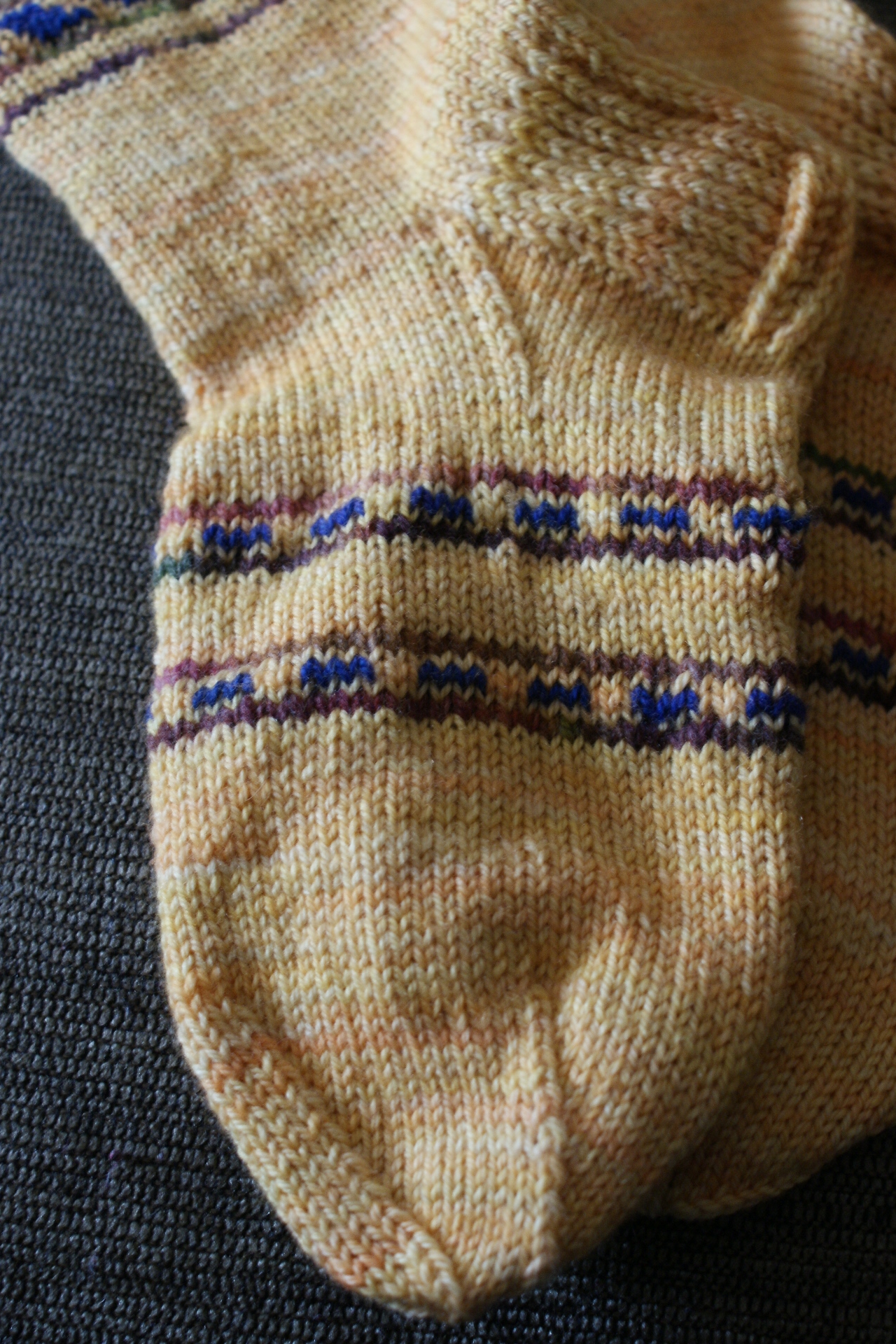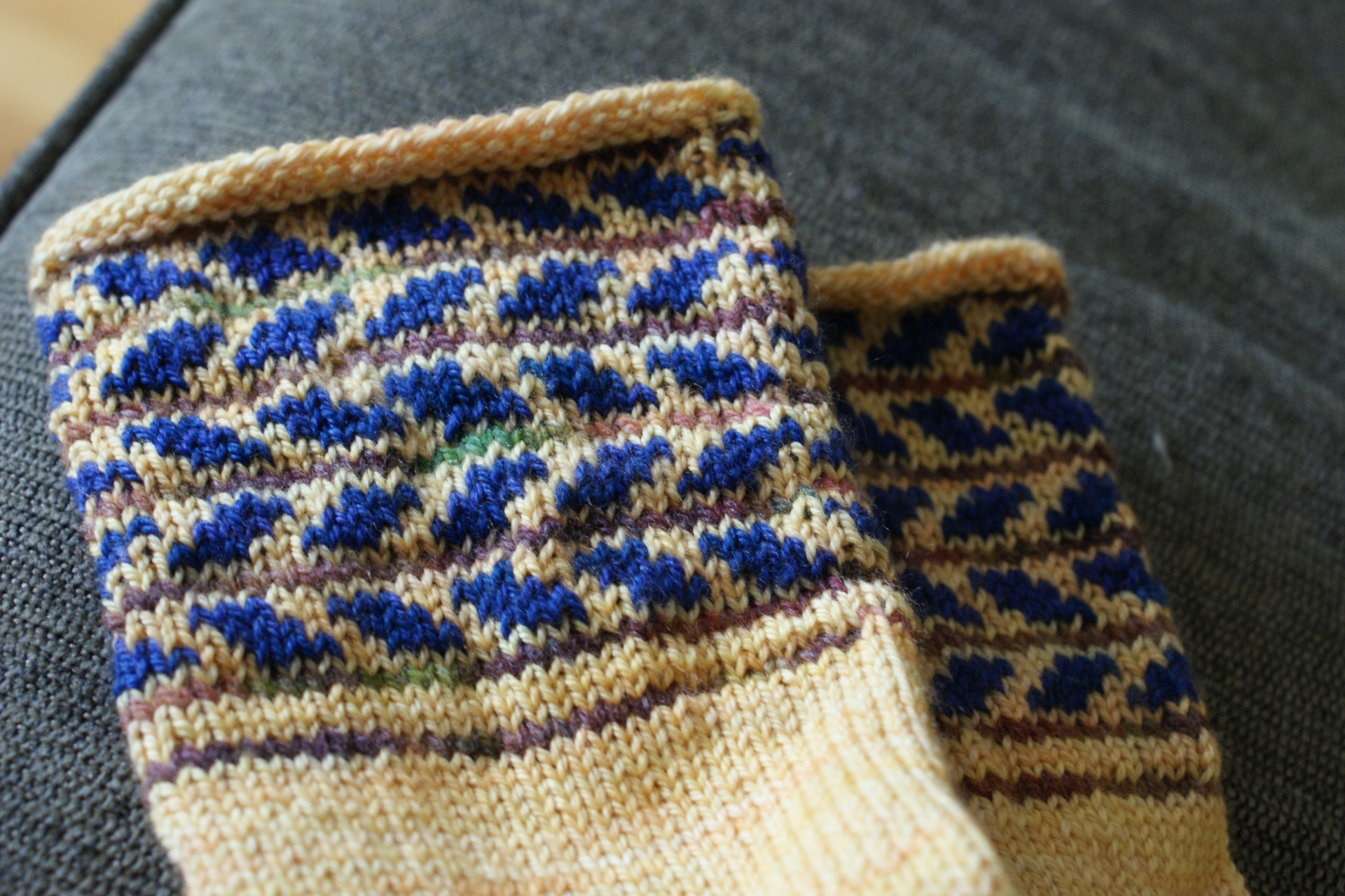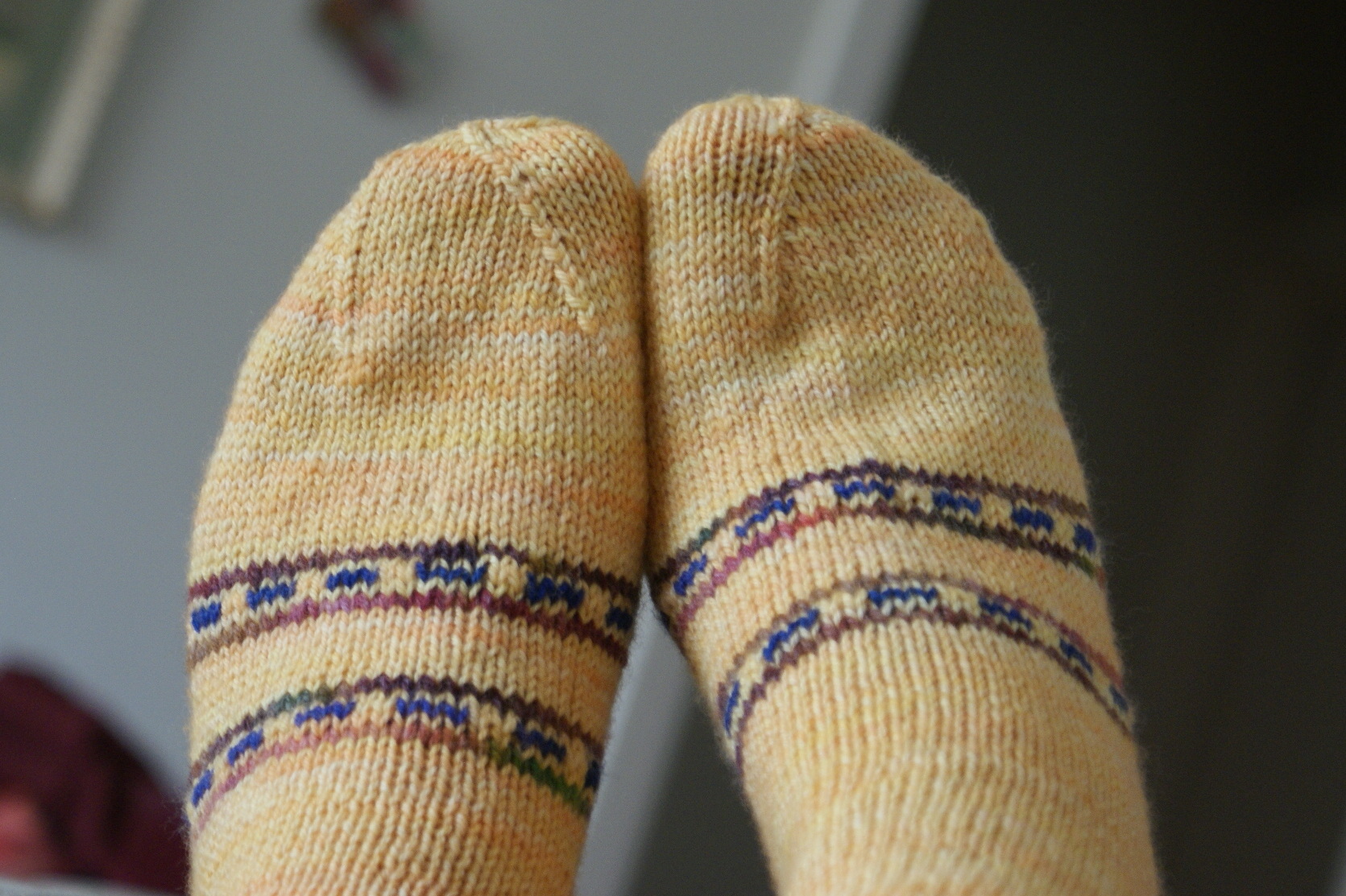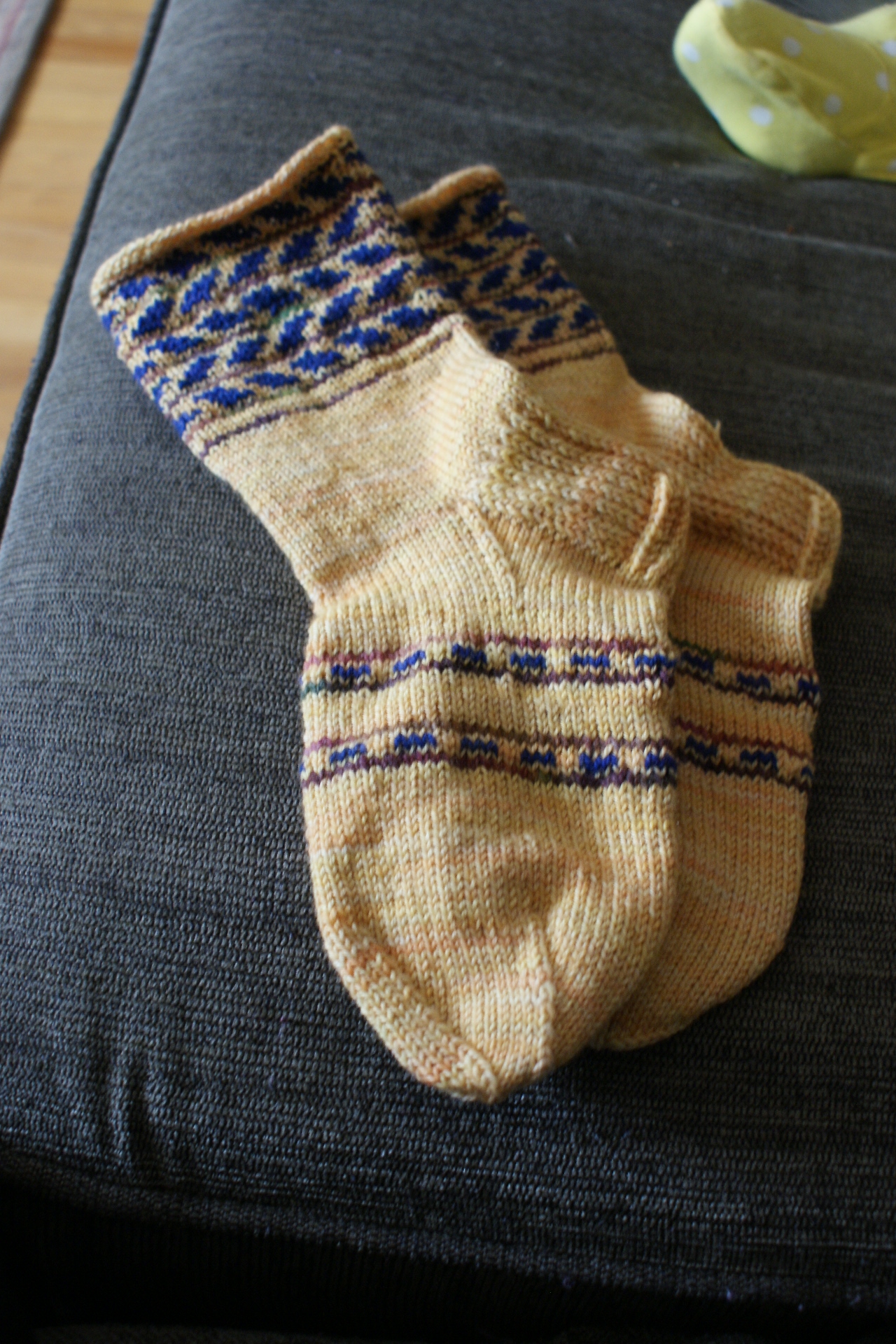 Well, I do have one not-quite complaint. Out of all the toes on all the socks that I have made over the last half-decade (probably 30 pairs), the only toes I have ever had give out on me are round toes. Nancy Bush seems to have a thing for round toes, over the more common contemporary ones with side decreases and kitchner in the middle (I forget at the moment what that type is called). I suppose they tend to give out because the round toe is finished by threading the yarn through the last 8 stitches and pulling tight, like at the top of a hat. That’s a lot of tension on one little bit of yarn at the toe, a well-worn spot on the foot. I tried to compensate this time by weaving the end in further, but I realize as I write this that that probably won’t make much difference. The issue is rubbing and tension on that one gathered point that makes the yarn in the point give out. Maybe it would help if I put the yarn through the last 8 stitches twice? Maybe she said to do that and I ignored it.