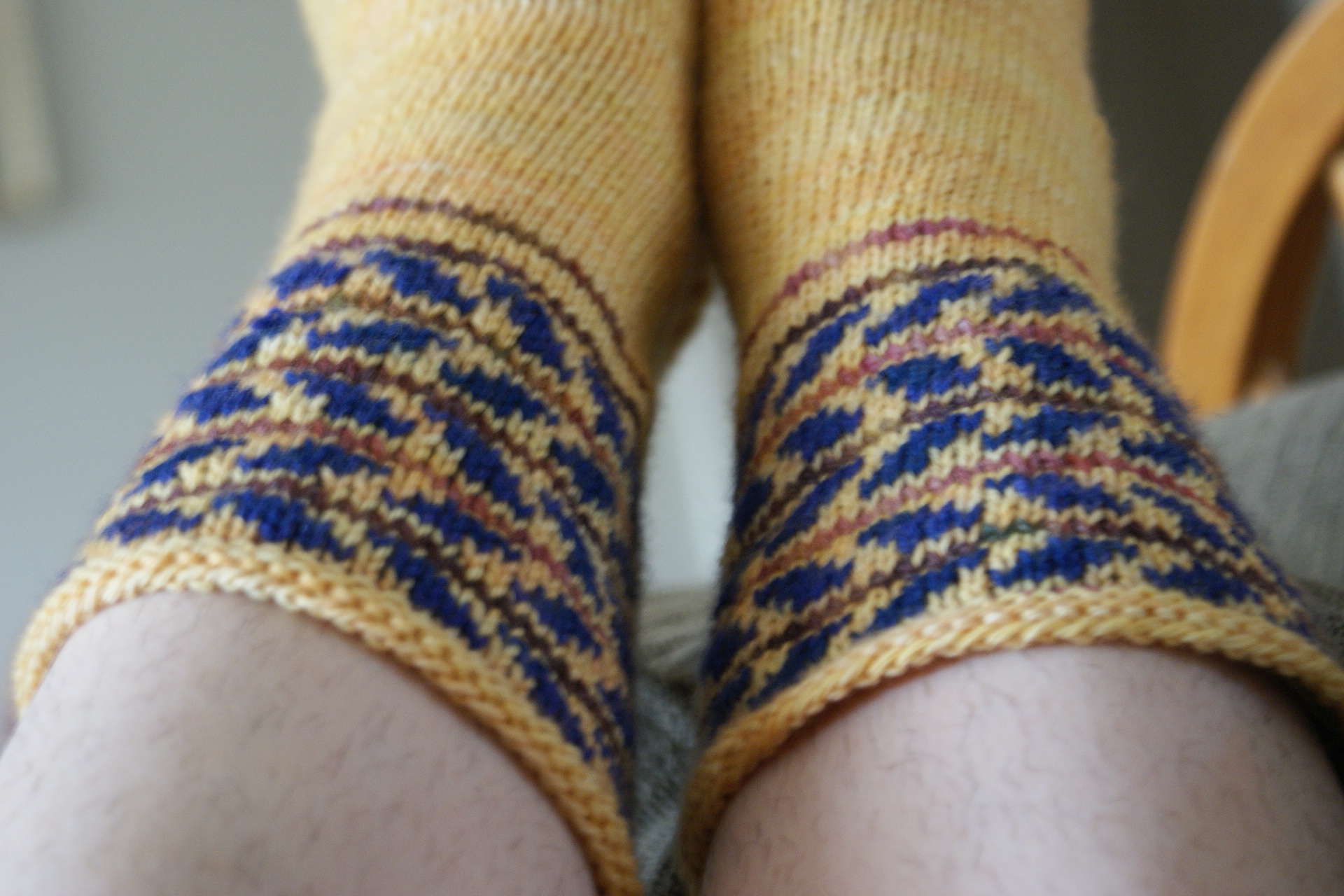These are October’s entry from my tour of the world via knitted footwear. Knitting randomly through Nancy Bush’s Knitting on the Road, this pair is called “Santa Fe.” Apart from making me break out in song, the design around the cuffs is also reminiscent for me. Ms. Bush said the cuff design was modeled after a Navajo basket pattern. I realized that at a church meeting I go to every week, on one of the shelves is a set of baskets with just this pattern! I had stared at them in interest on many occasions, and was pleased to replicate it. I wish I could find a picture of the pattern now.