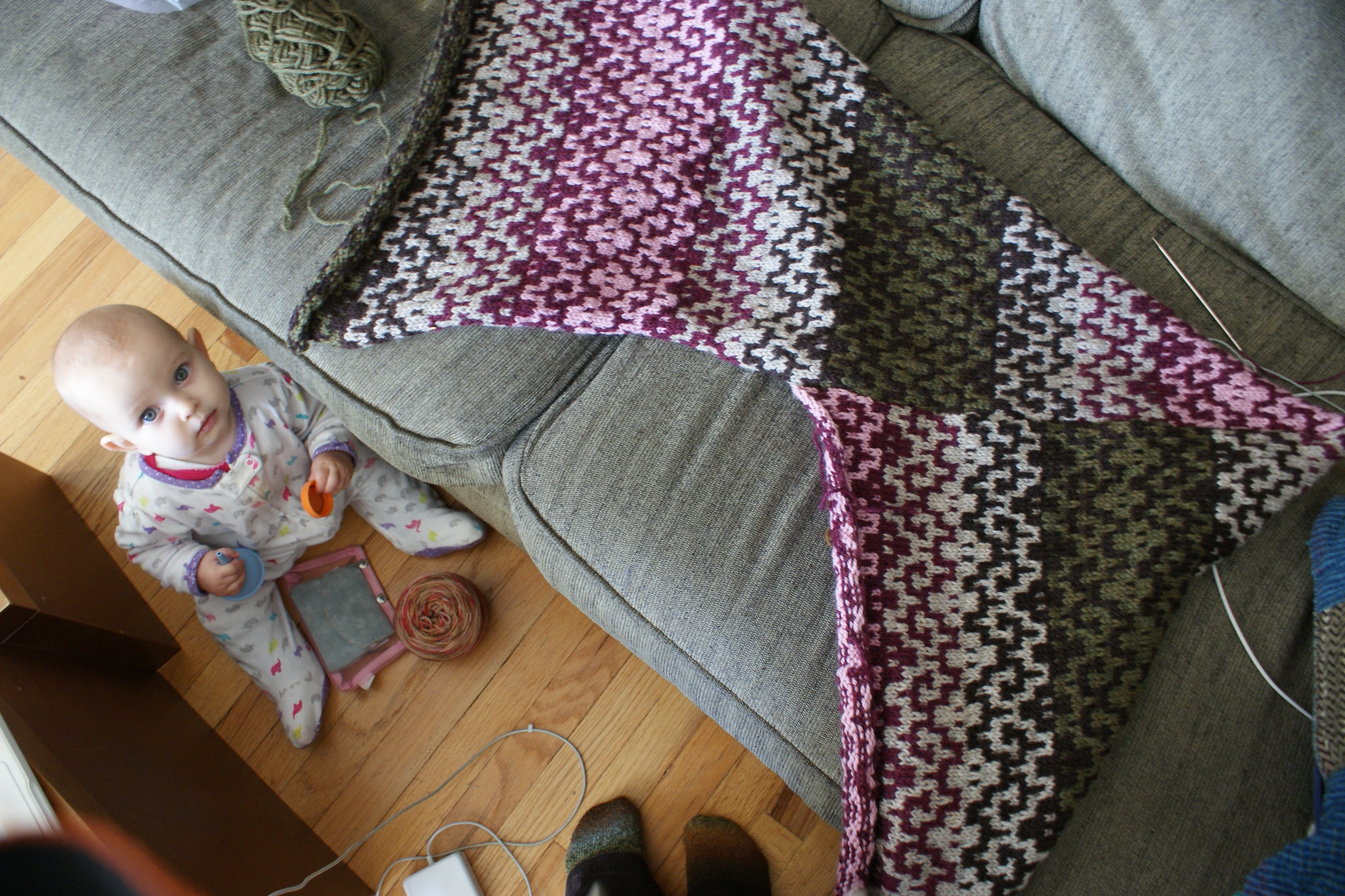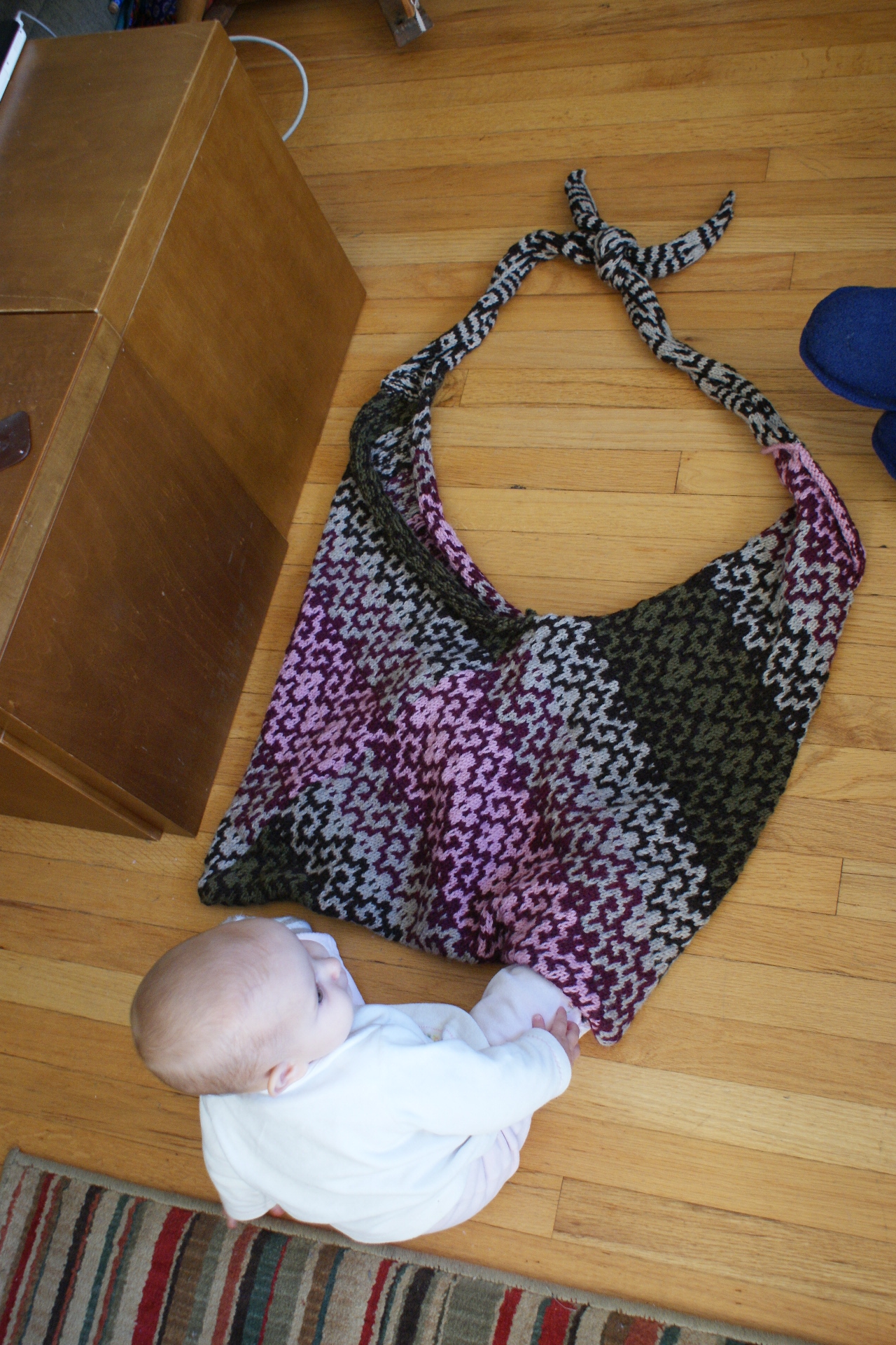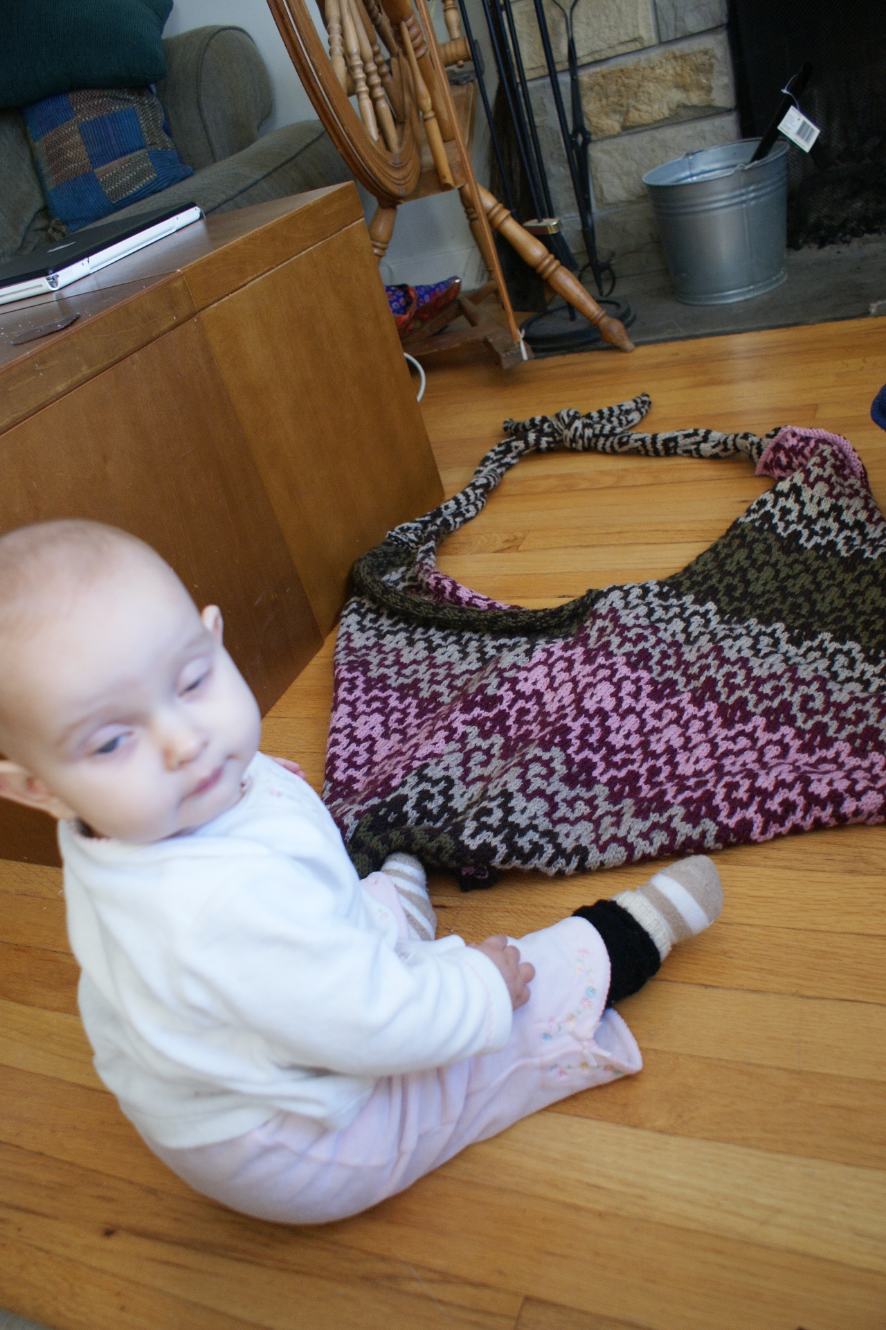 It looks pretty in these pictures, for which I am glad. The stitch pattern is beautiful, and I think I should get a ruddy Pulitzer for my color selection. But its usefulness as a bag is going to be limited. With a few extra instructions, or some extra attentiveness and experience on my part, these problems could have been averted. I hope I have provided some help for others to make this piece with more success.