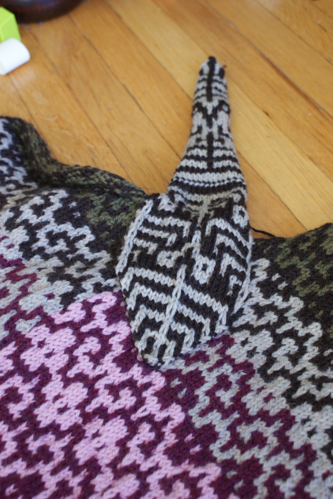 3) This would require more yarn. I used up all but a few inches of the burgundy, and had to buy extra of the brown and grey. Or, more realistically, casting on fewer stitches. This isn’t the pattern’s fault; it called for 250 yards of each color and I only bought one skein each of Patons Classic Wool, which has 223. I might still would have needed extra to make the accessories if I hadn’t accidentally bought an extra color, though.