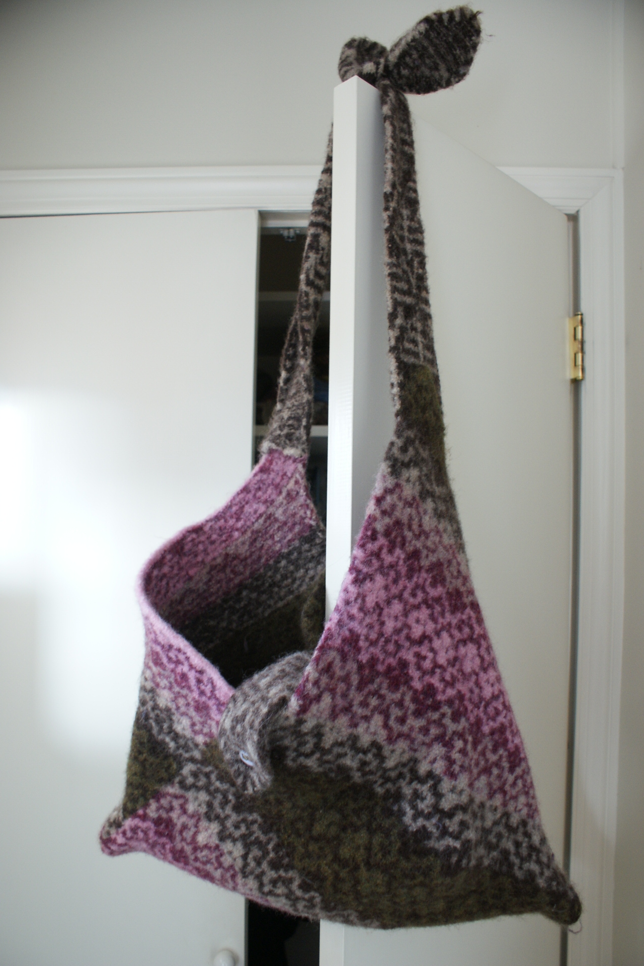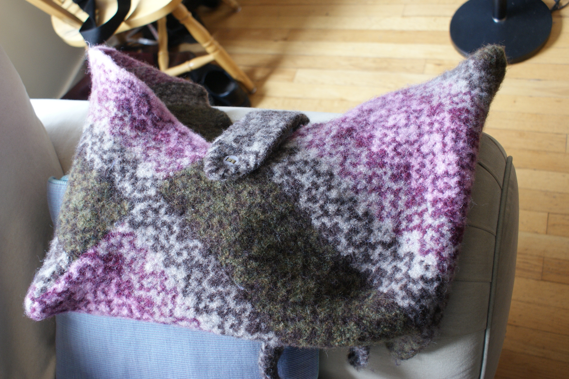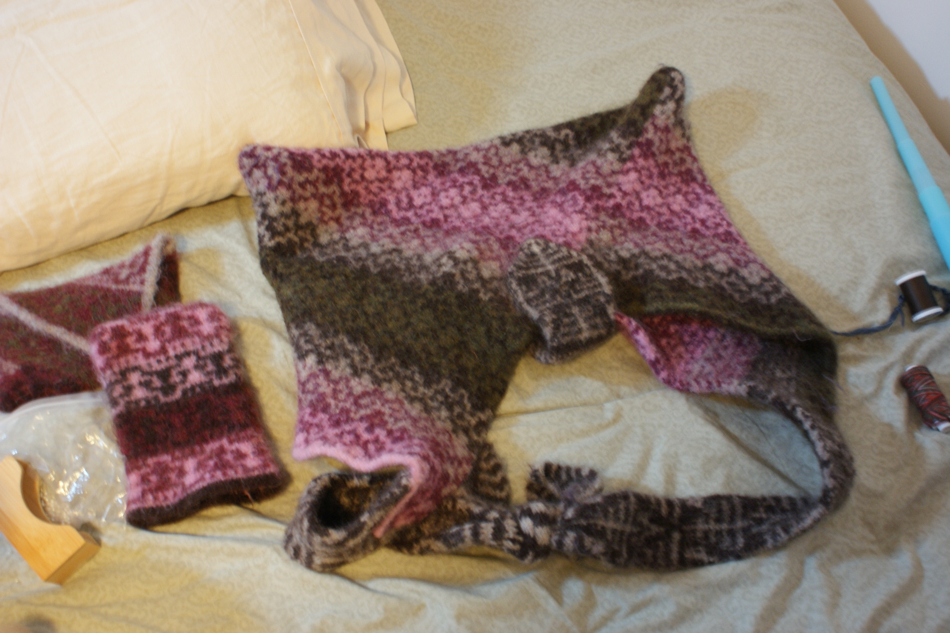 It was a good idea, but it didn’t quite work. The corners were too pointy, the felting had already been too severe, and the new corners I was trying to make didn’t quite take. The cast on/bind off edges were still much floppier than the selvedge edges, despite all my manipulations, and look rather ungraceful.