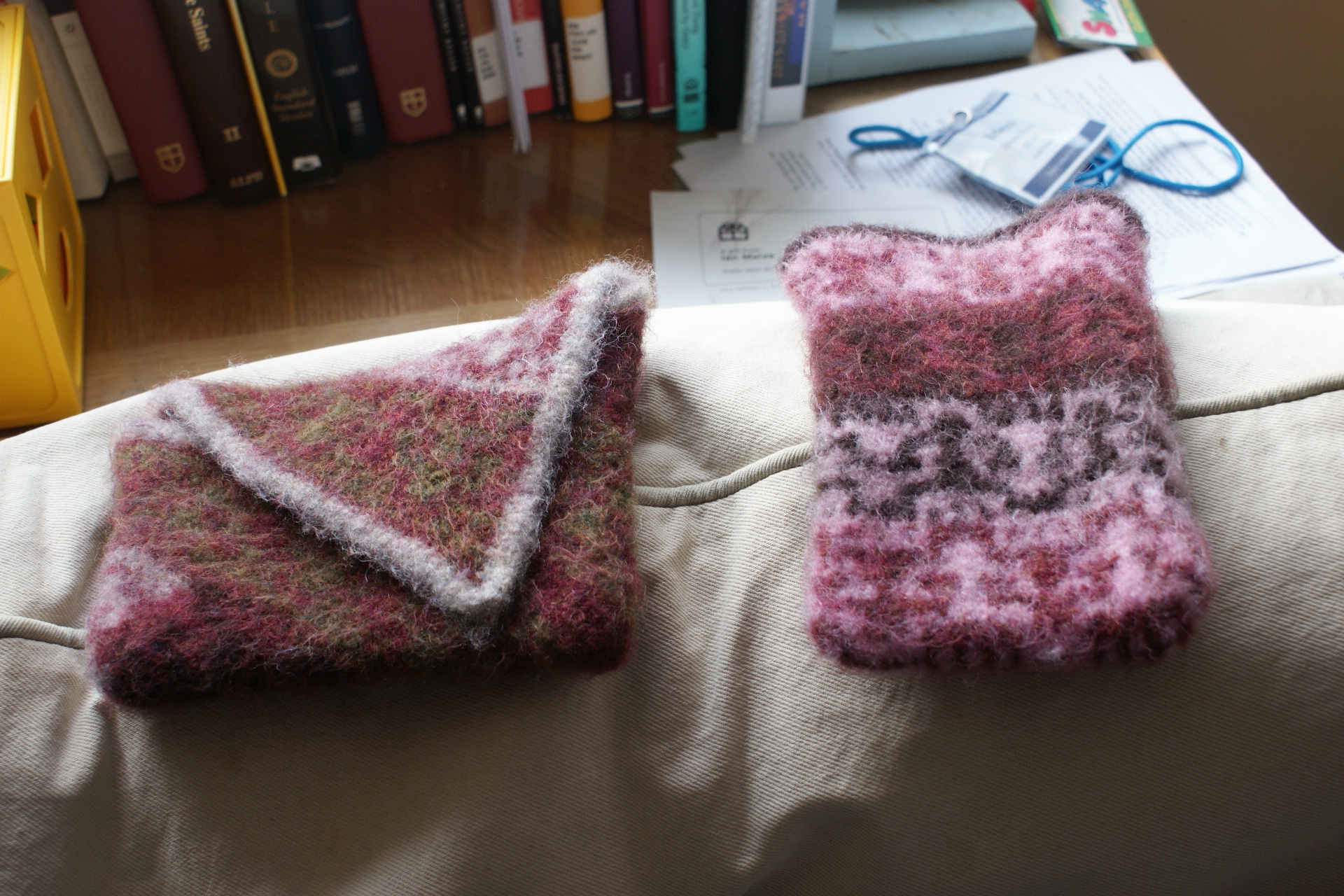 1) If I ever again take on a significant-sized felting project on which gauge matters, I would felt a swatch first. The water and electricity for an extra wash cycle is worth it. I had the little bags (which turned out just fine, by the way) as samples; a run through the washer would have told me what I needed to know. See how askew the change purse is? That could have told me in advance how off my purse would be if I didn’t make some changes.