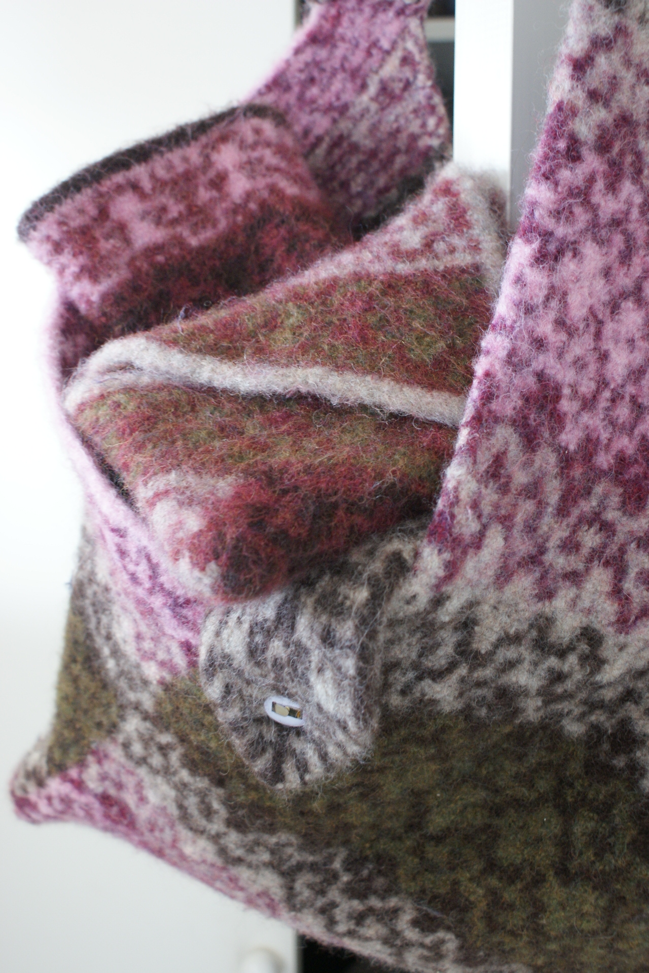 As I described before, it was rather difficult to explain how the beautiful (and very large) strip of mosaic knitting I was working on was going to end up being a bag. It is finished now, and you can judge for yourself whether or not I in fact succeeded in making a bag.