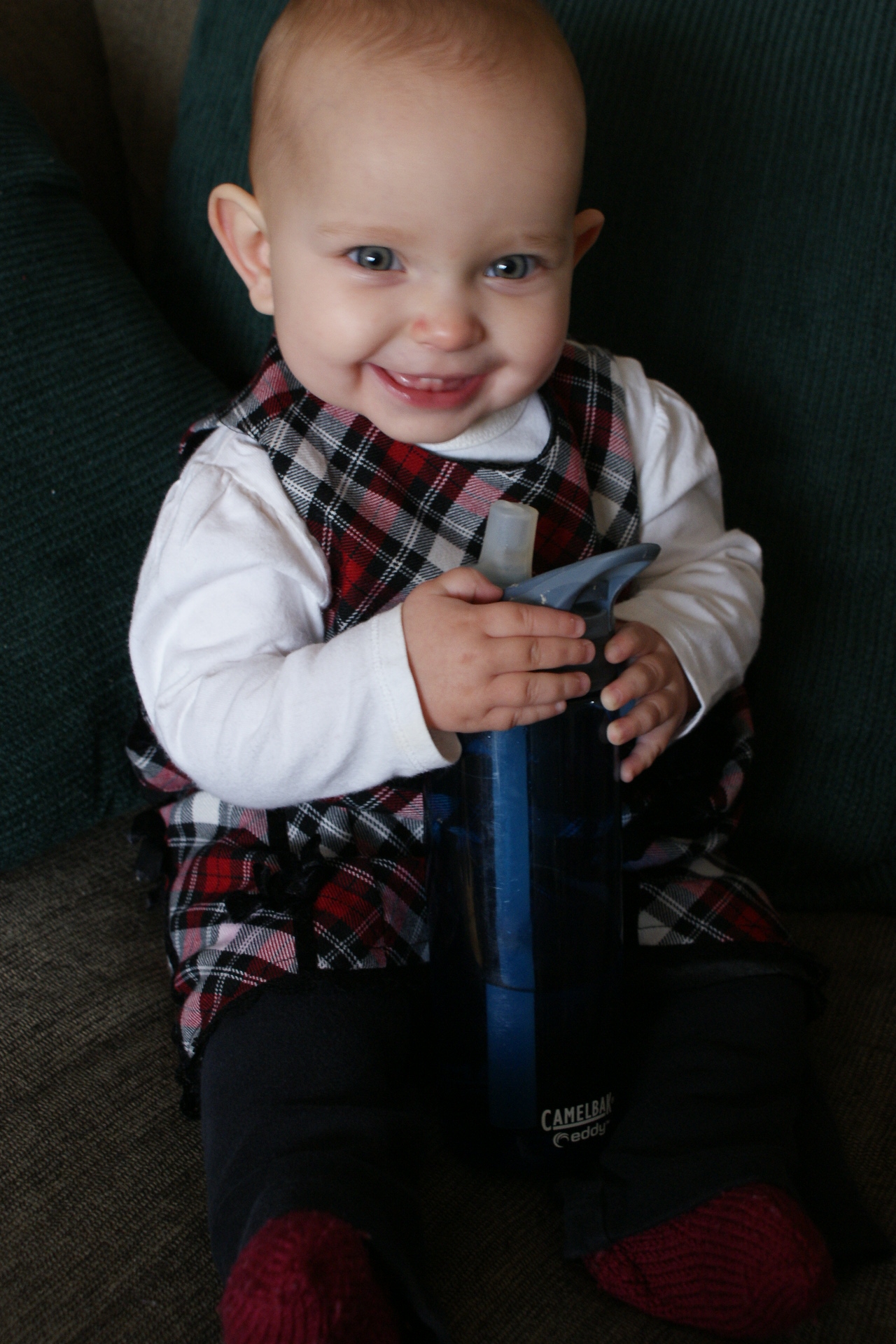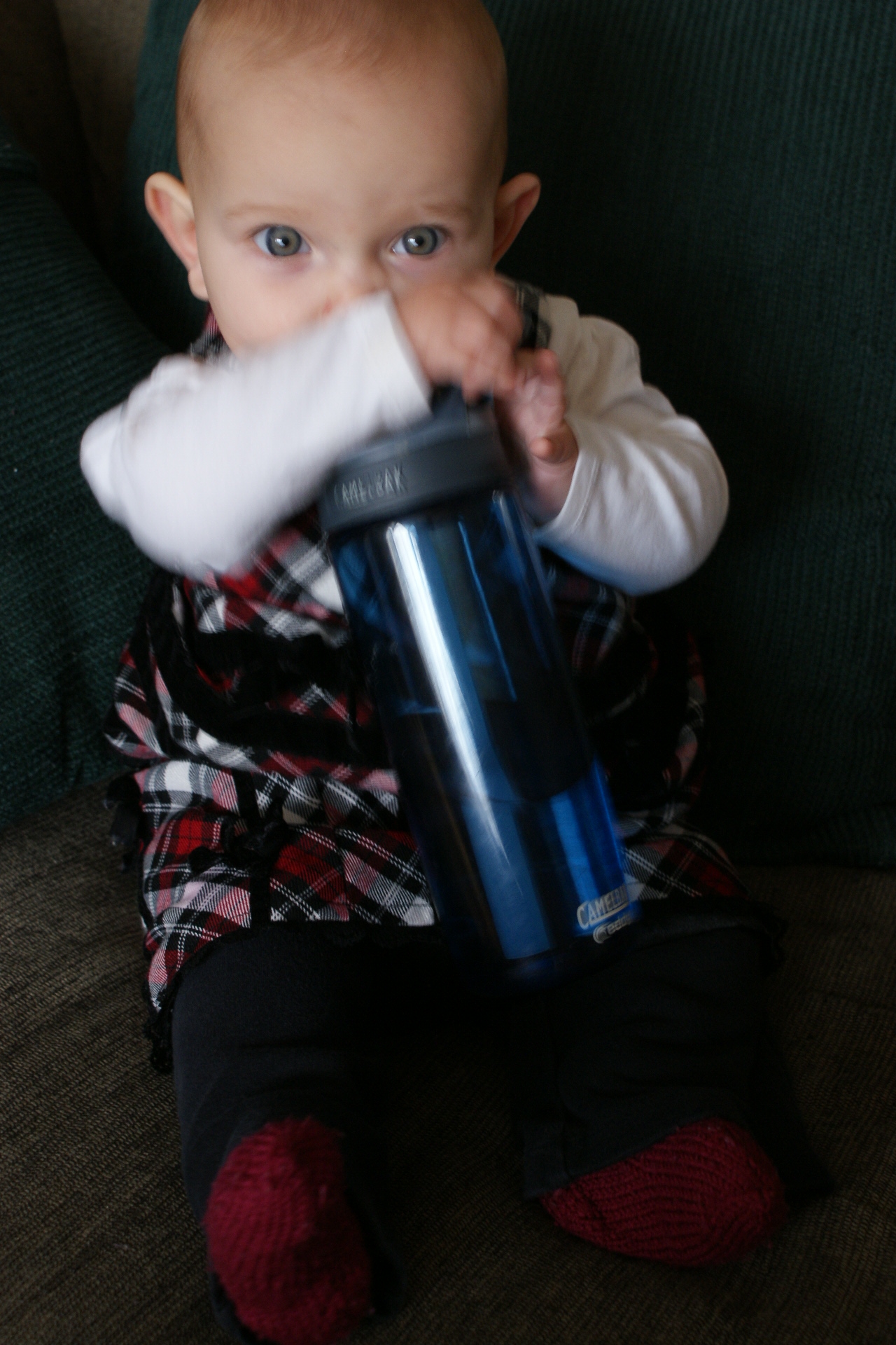Naomi thought so. Well, at least that’s how she feels about her (read: my) more successfully TARDIS-blue camelbak. Drinking out of it has been one of her favorite morning activities for at least a month. We’ve gotten to the point that the first thing does after her morning nurse is attempt to climb over to my nightstand to steal it.
