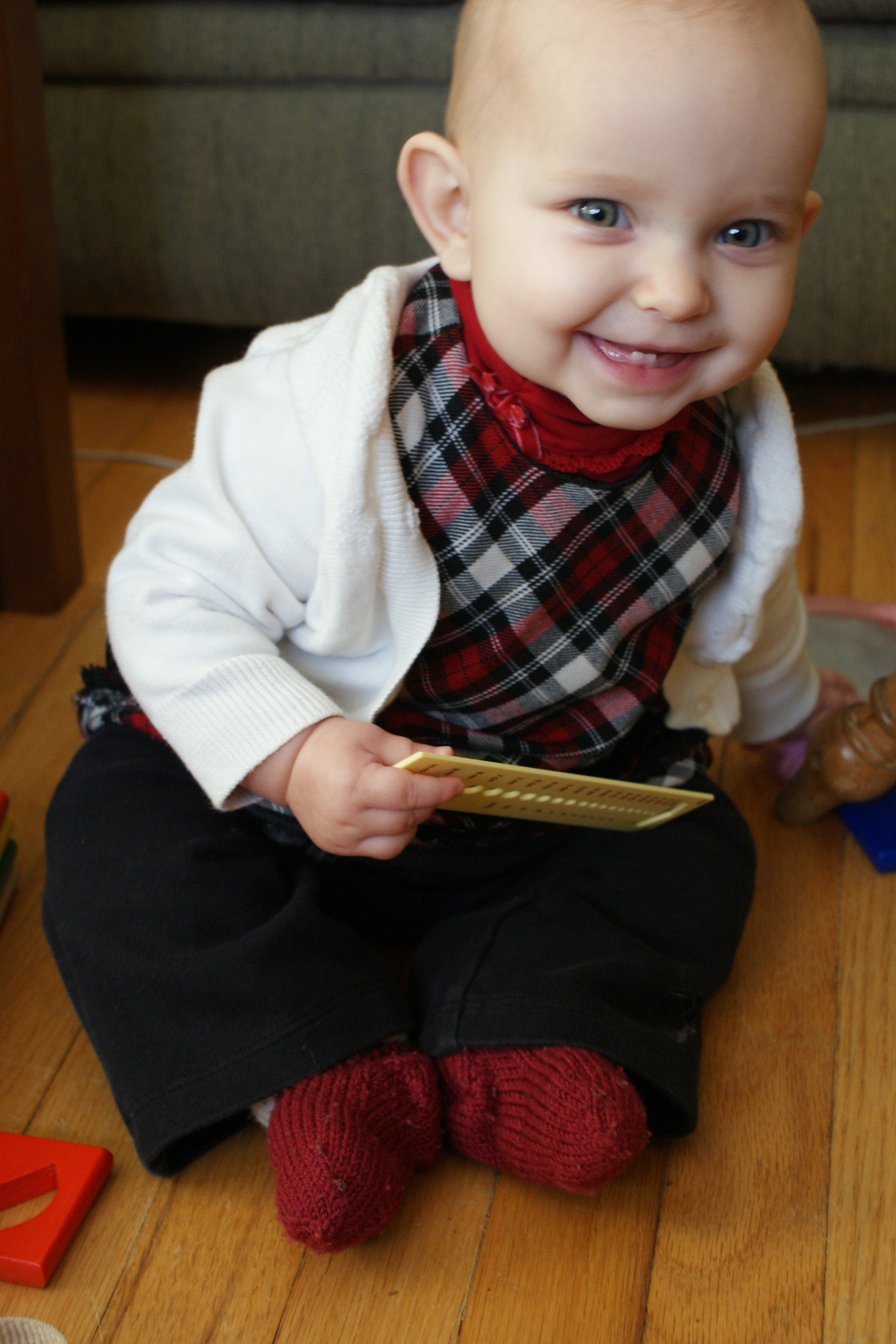 3) Object permanence. This is a glorious thing. Like, I can walk out of the room for ten seconds without her being overwhelmed by emotions of abandonment. (Or she’s just already stuffing it, but I doubt it.) If you put 2 and 3 together, you realize what I have is a glorious window of time when she is entertaining herself happily and not (particularly) mobile. Like, yesterday I swept and mopped the whole downstairs floor while she played with blocks on the rug. It was amazing.
