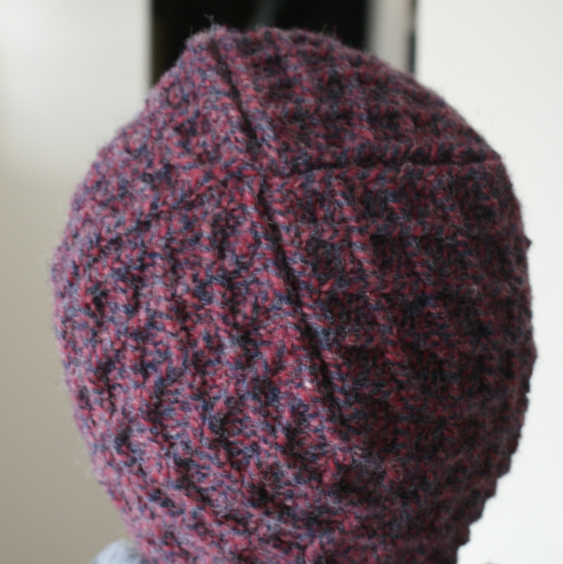 It was easy enough to incorporate the same pattern into a hat. The real fun came in designing the crown. With little watchcaps still on the brain, I took a similar tack, making the “X” shape even more defined by leaving a two-purl valley in the middle. It looks marvelously architectural, in my never-too-humble opinion. And it actually fits him! My ambitions in previous years left my enduring husband with hats too thin, too floppy, or too big; this one Actually Fits. I knit it down very tight (as is traditionally done with Bavarian twisted stitching), so it’s a very dense, warm fabric.