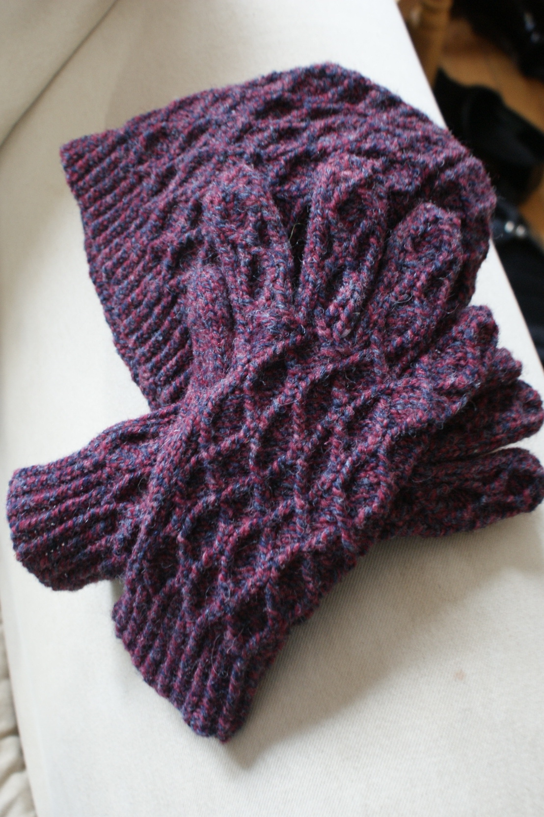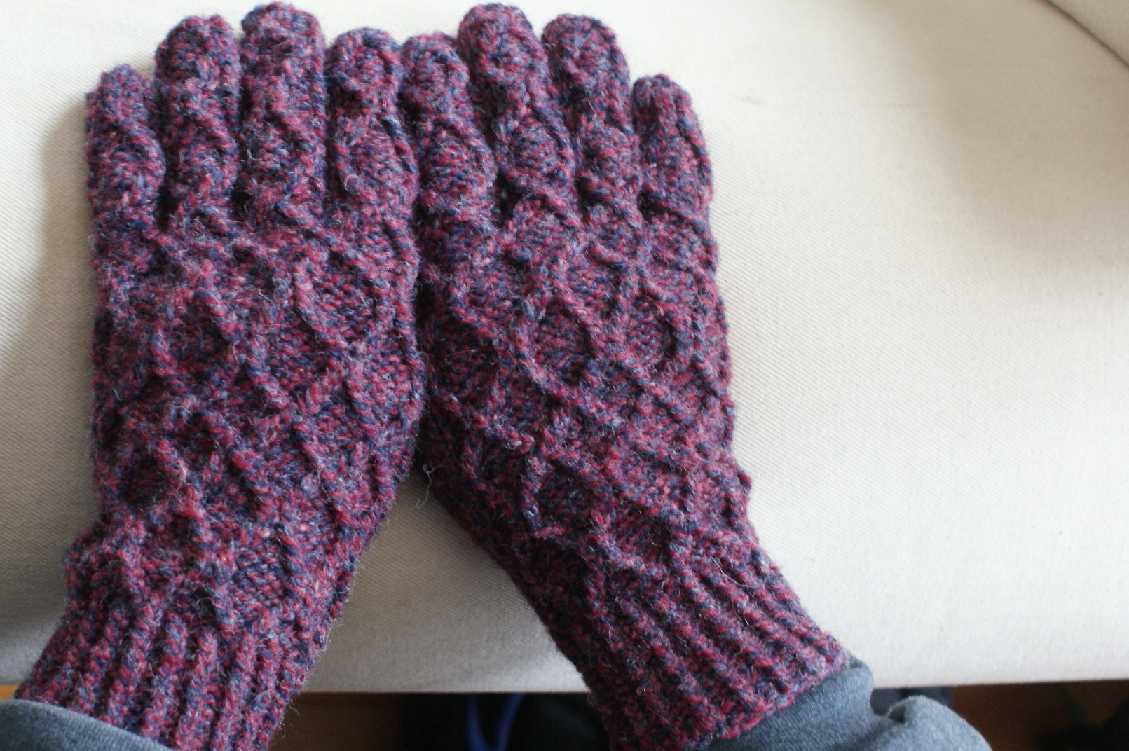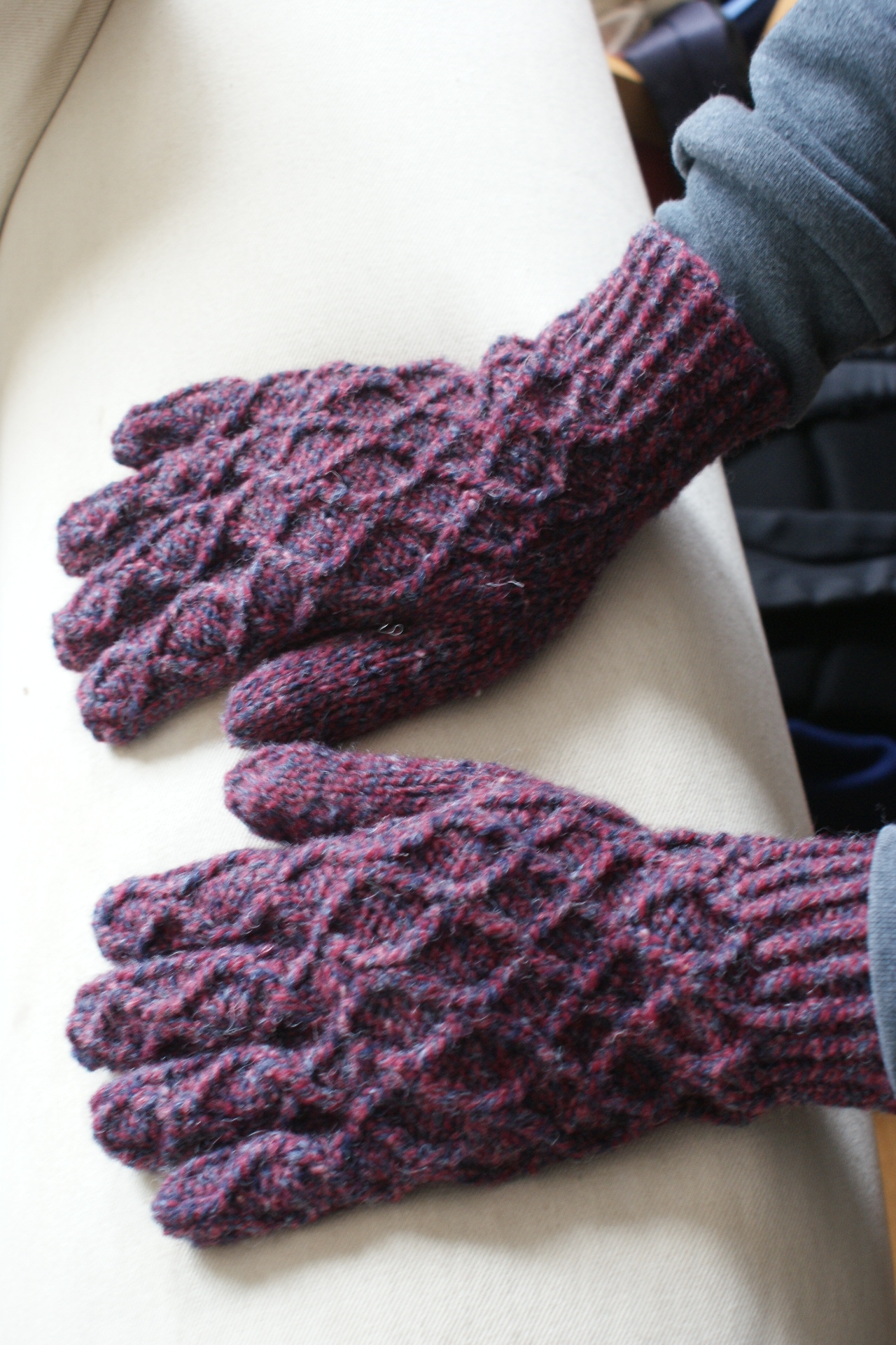 Yarn Review: Since we are being particularly economical this Christmas, in addition to choosing the item, we also knit each others’ gifts from each others’ stash. During our trip to RI last summer, Jared had fallen hard for some very woolly marled yarn from “Bartlettyarns, Inc.” and bought 2 skeins. Jonne, the shopkeeper, told us how he had visited the mill, wherein they still use a mule to run the machinery – hence, “mulespun.” Jared suggested the yarn would make good gloves. By Jove, he was right. And as I suspected, the twisted stitching showed off this woolly stuff marvelously.