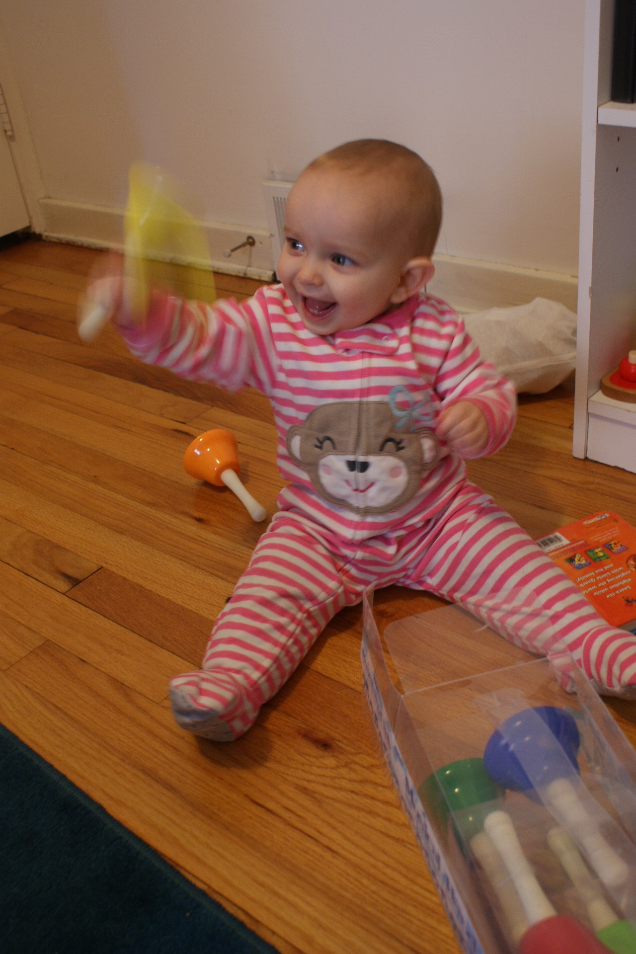 She’s growing like a weed. Now that she fits into 12-month sleepers, which have grippies on the bottom of the feet, she is pulling up on everything. See the photo series below, which started out being of my feet, but was soon distracted by the background action.