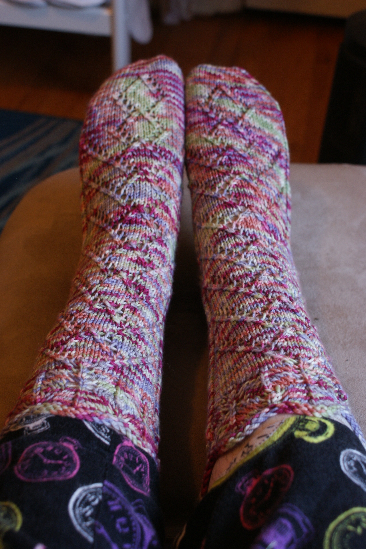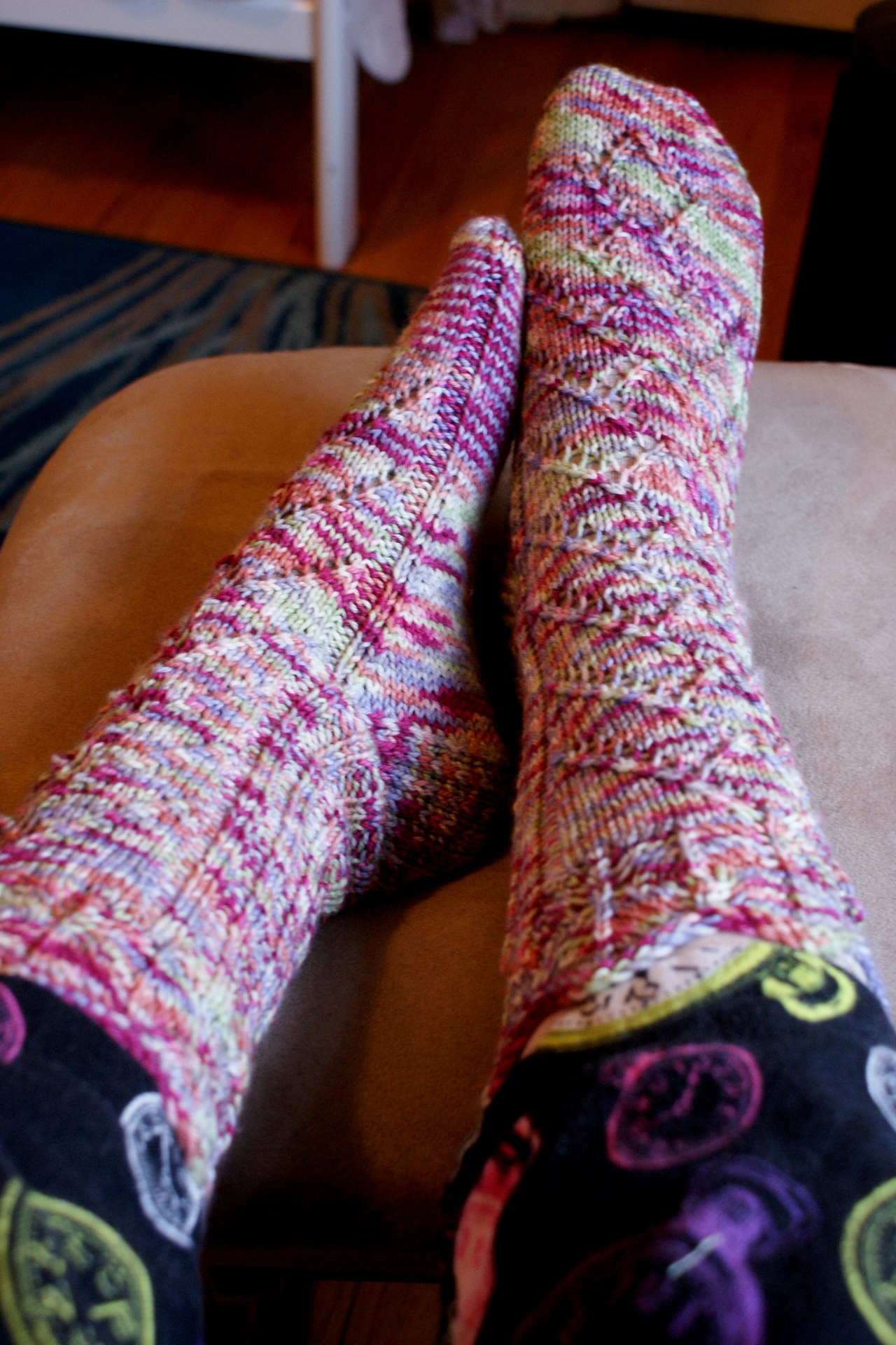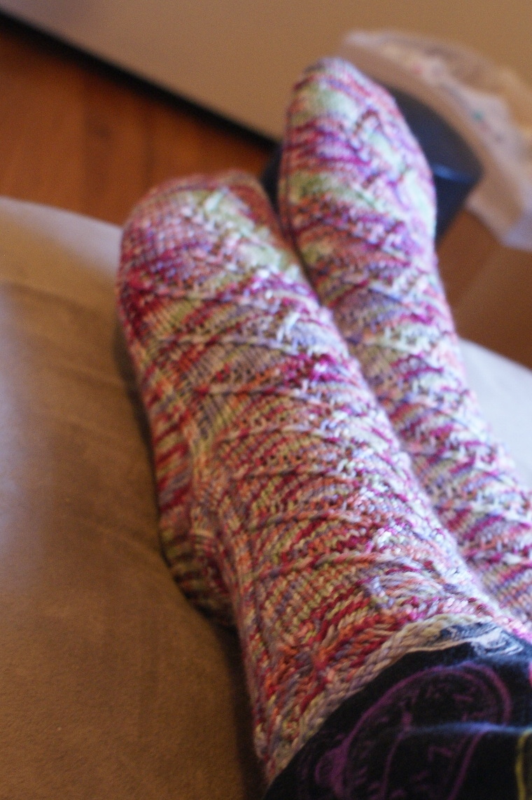 The Pattern: “Friday Harbor” from Knitting on the Road by Nancy Bush. I enjoyed the simple lace pattern, which includes a pleasingly funky little leafy cuff. My gauge was a little small, surprisingly, but it was easy to alter. I cast on 60 stitches instead of 50, knit the leg on 57 instead of 49, and the foot on 50. I also kept the two purls on either side of the lace pattern going all the way down the foot; that I did largely because I wasn’t paying attention to the pattern. If you would like to make these, I can advise that they are definitely boot socks, especially knit in the given gauge.