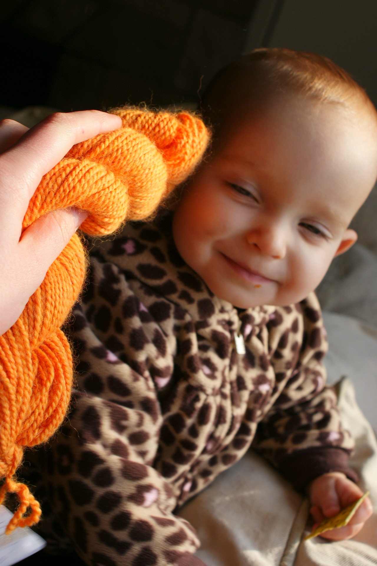 Their selection is small, but the space there is gorgeous. Airy and open and colorful. Naomi and I were wandering up and down the yarn wall, looking and touching; they have a lot of Blue Sky Alpaca. I was pulling a few out and feeling them on my face and Naomi’s, trying to keep her from doing too much damage – when she pulled out an orange skein and felt it on her own face! She petted it gently, closing her eyes with pleasure.