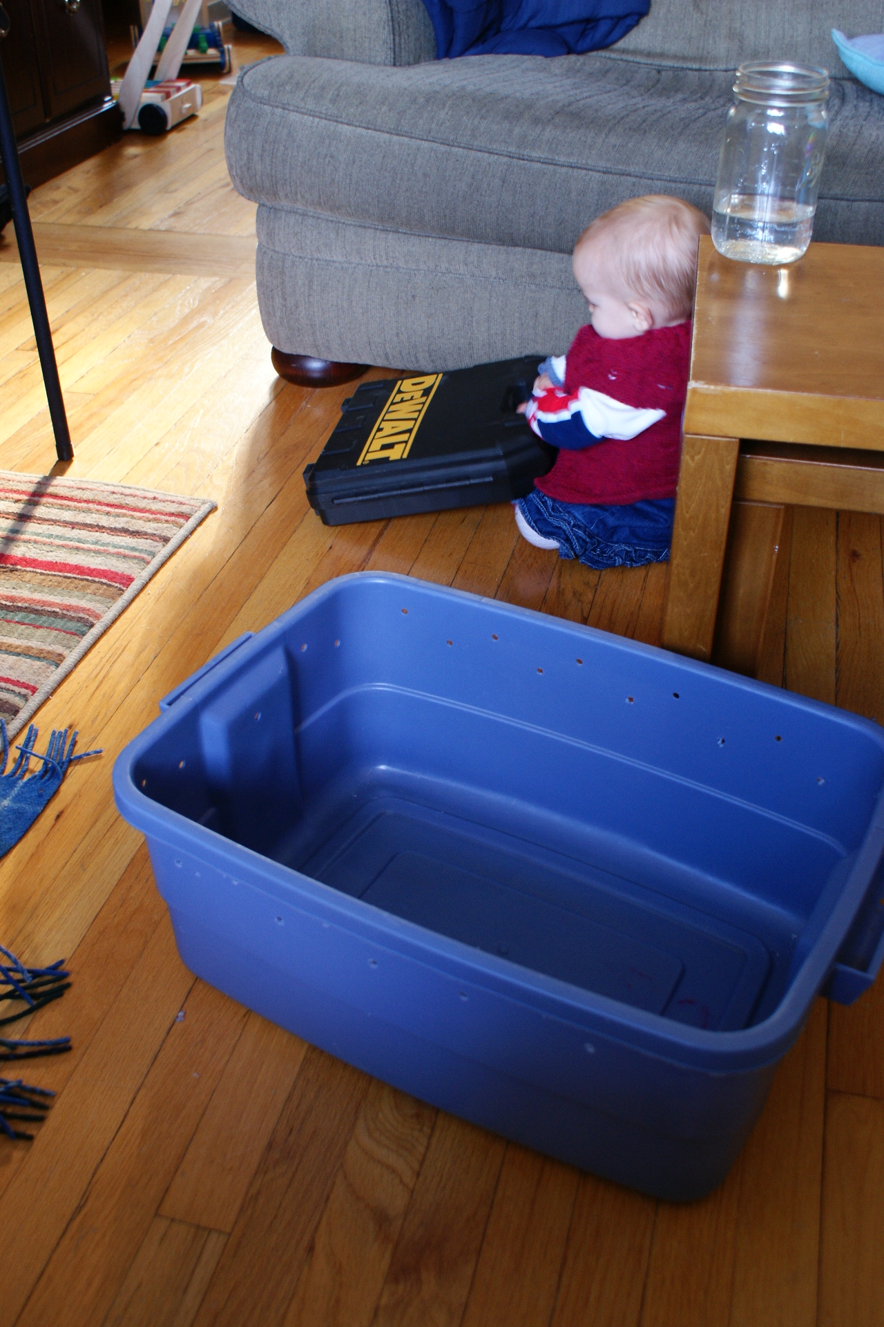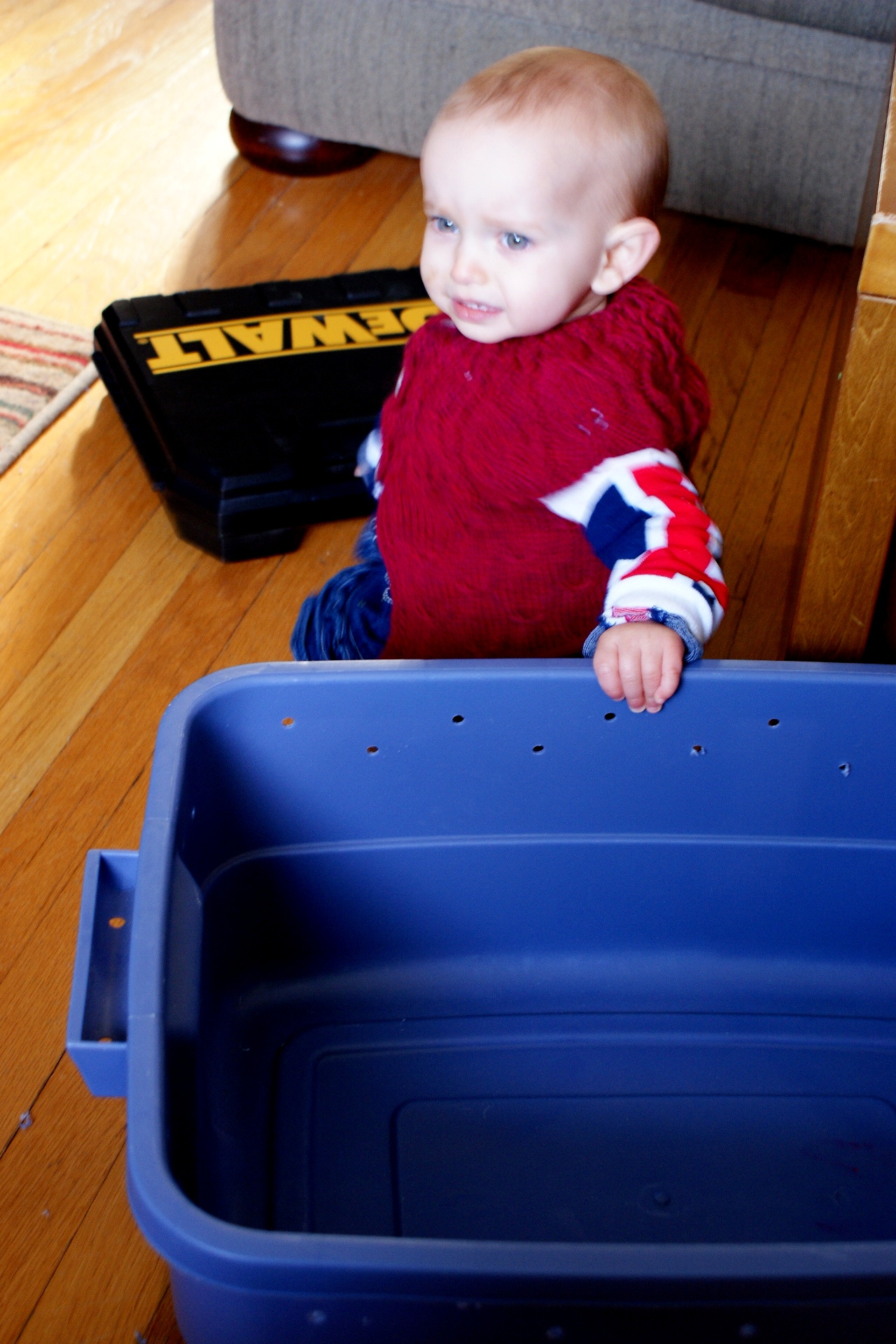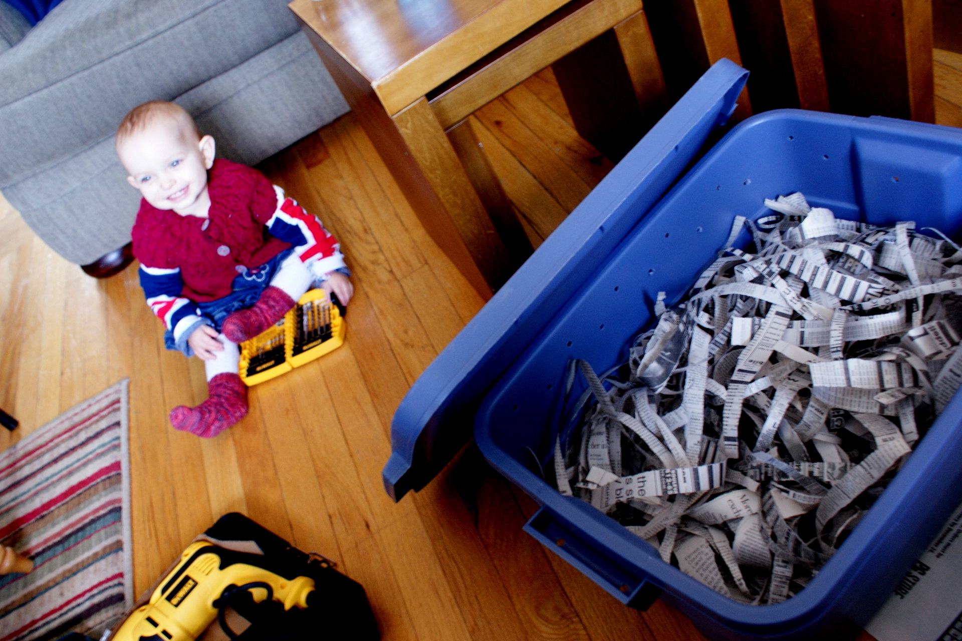 I was able to consolidate a couple yarn bins (Yay for successfully knitting from stash!) to set aside this excellent bin for our impending worm friends. I thought tearing up newspaper would be an excellent activity to share with my 13-month-old, but it turns out she would rather play with the power drill. Never mind that when I tried to drill one of the holes in front of her, she thought it was Evil Incarnate. Understandable.