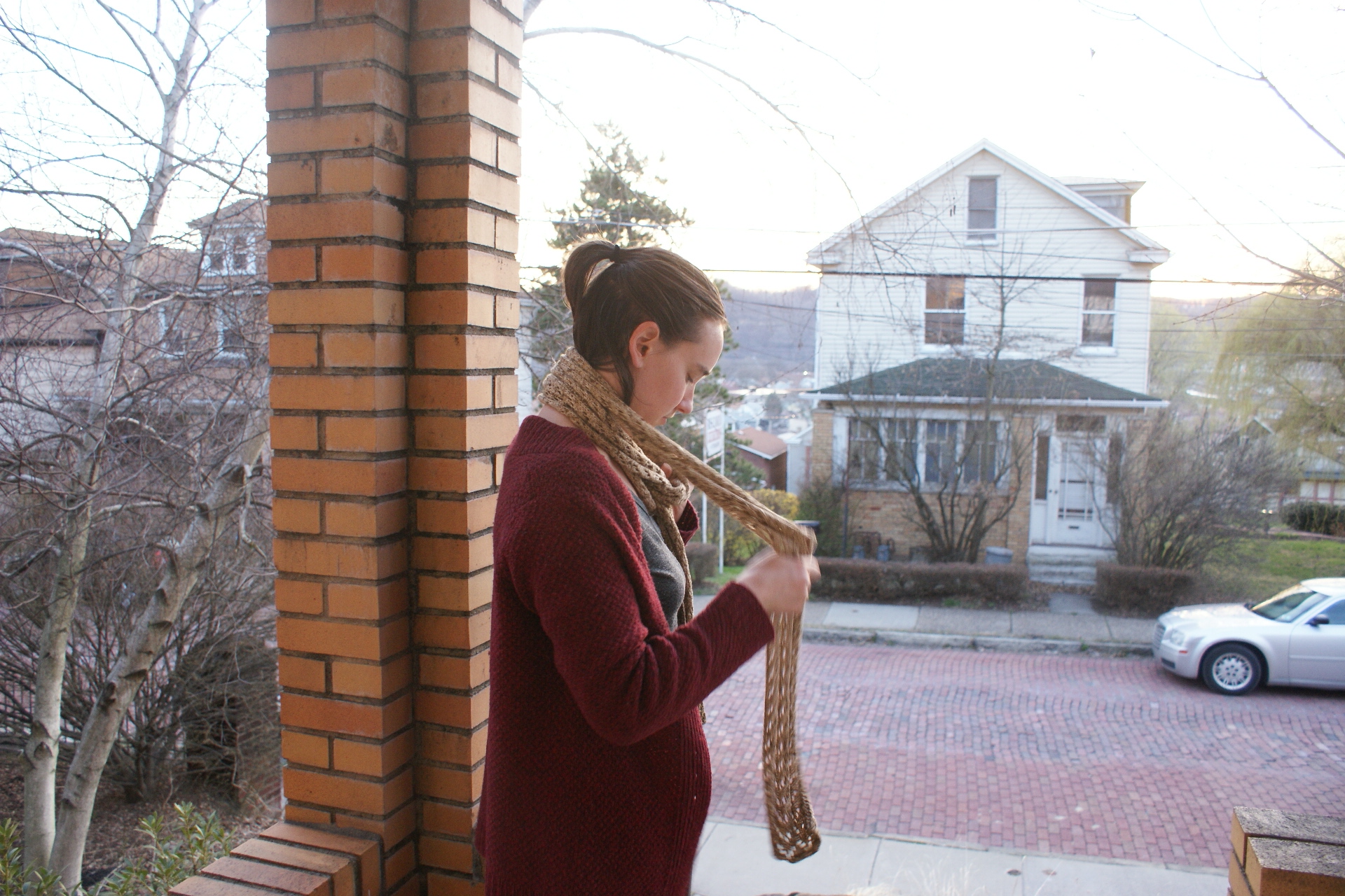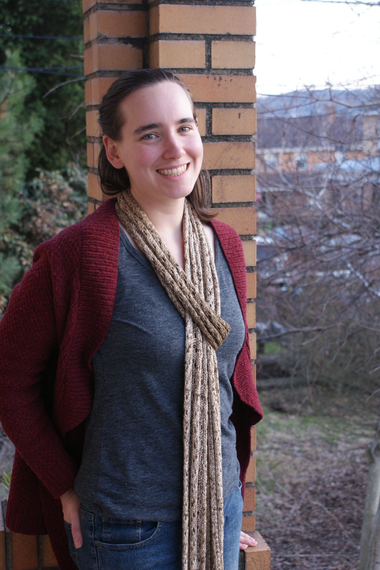 I decided to get a little clever, and invented a new kind of scarf knot to get rid of some of the slack: