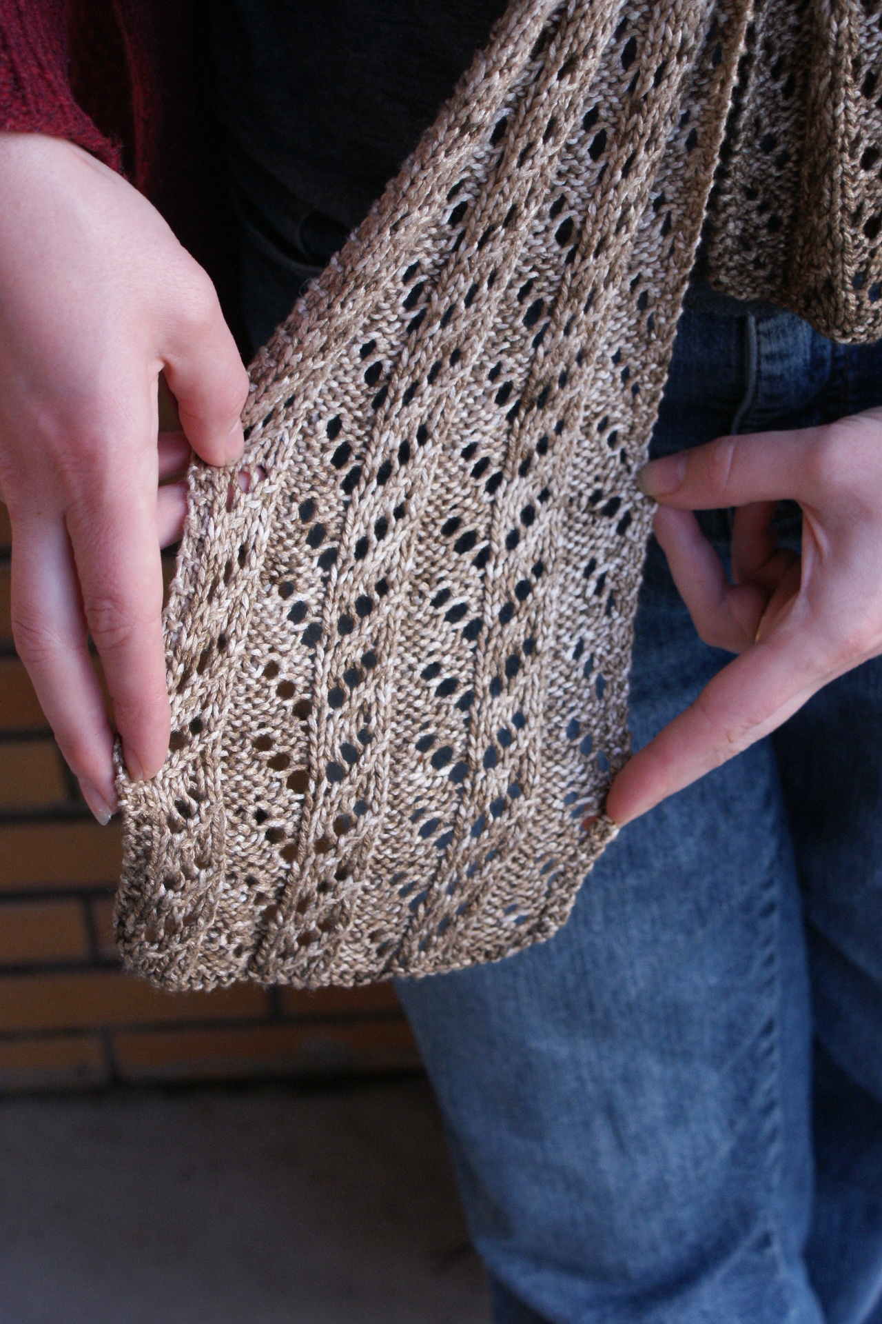 This is partly because I made it so long, but I blame the yarn for that. The yarn was a little something we had picked up during our crazy South African layover five years ago. (My stash backlog has gotten pretty severe.) This 100% bamboo yarn is native to South Africa, and is called “Vinnis Colours: Serenia” per the ball band. I’m pretty sure it’s marketed in the US as “Be Sweet.” Anyway, it came wound in a ball, and looking at the ball I thought it would stripe. Not so much. The beginning and the end of the ball have a dark stripe, and the rest was a long stretch of tan.
