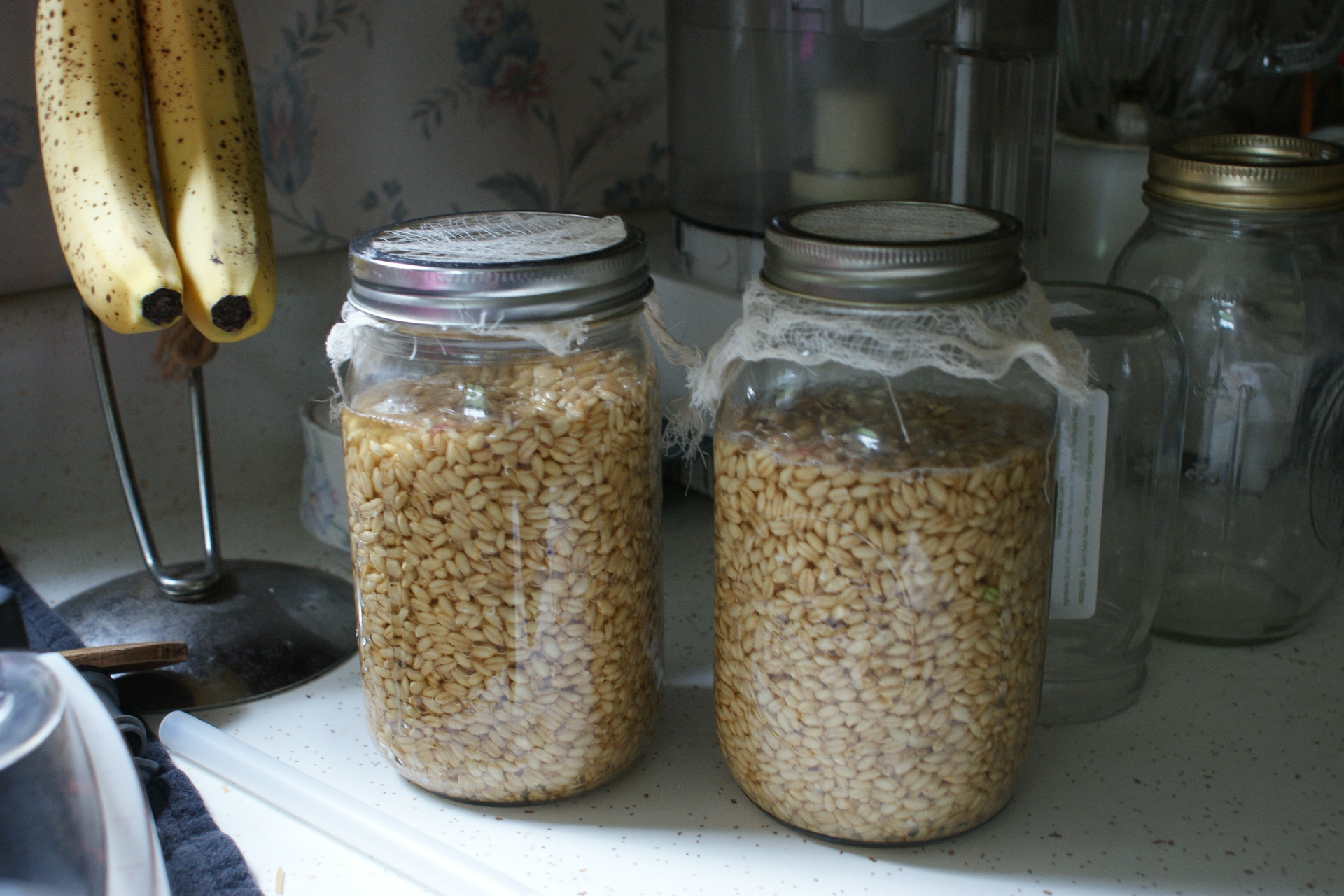 With my fruit fly problem threatening to return, I went for a slightly more enclosed sprouting system. I walked to Do-It-Best and sprung for a little bag of cheesecloth, so I could sprout my sprouts in their jars instead of open in a colander like last time. Thus I had on my kitchen counter that odd sight, made familiar to me in my browsing of other bloggers’ sproutings, of mason jars full of wet wheat upended in a pie plate. This set up allows the grains to drain and stay aerated at the same time.