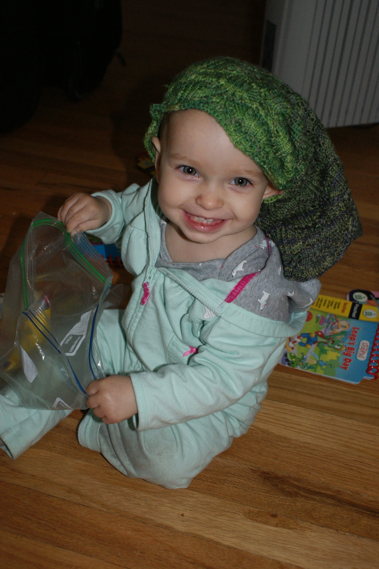 The cowl is just large enough to squeeze over my head, making it a good under-coat cowl. But it is small enough to make an elf-cap for my little ham. She kept it on for an hour, little goose. Ever since she learned how to say “hat” she has gotten rather excited about putting things on her head. And even though her use of the word “hot” sounds exactly the same to me, she seems to know the difference between the two concept. My little brainy.