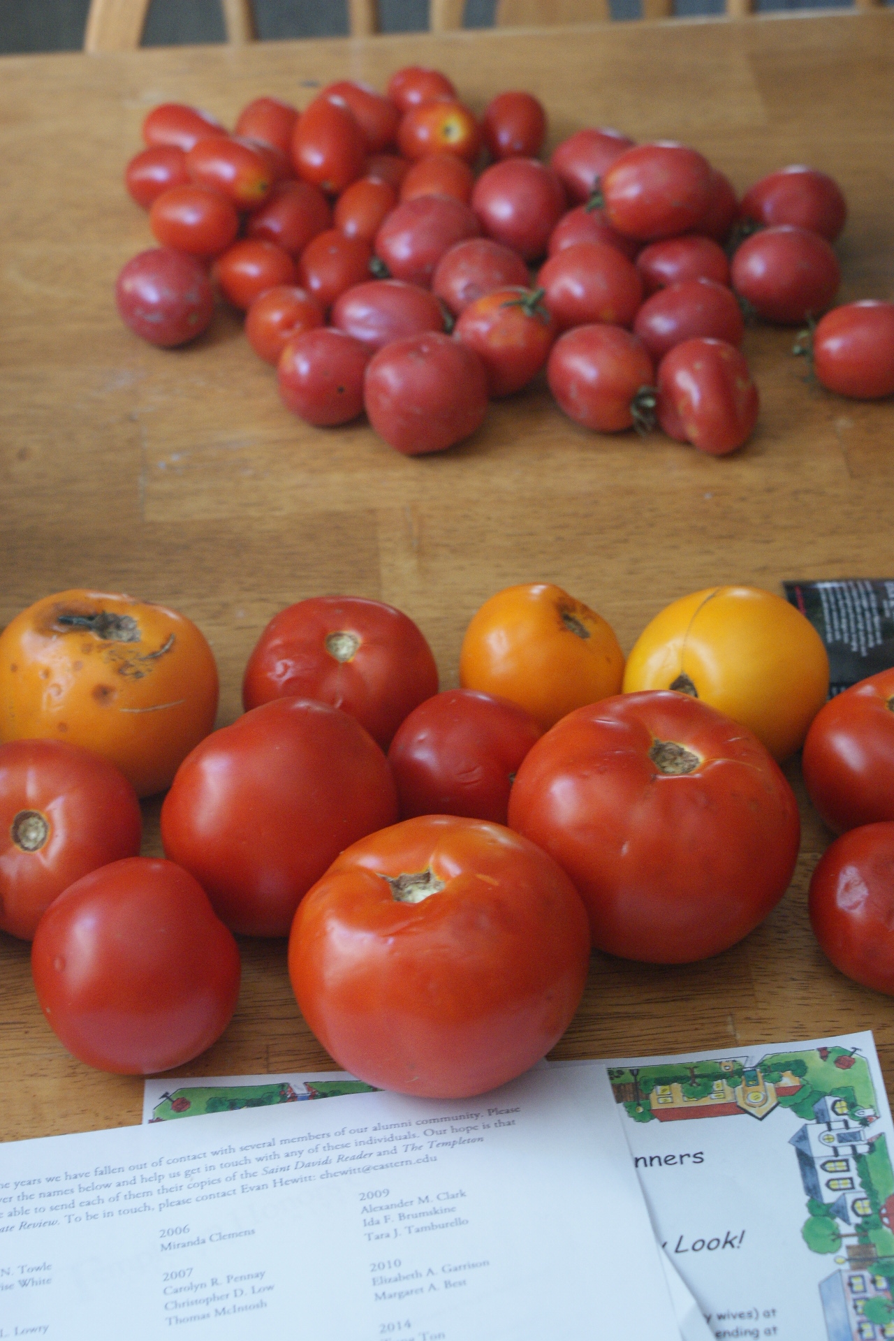 The juliette tomatoes – basically cherry-sized roma tomatoes – arrived when I already had an untenable quantity of tomatoes on my hands. So when my neighbor deposited these monstrosities on my hands: