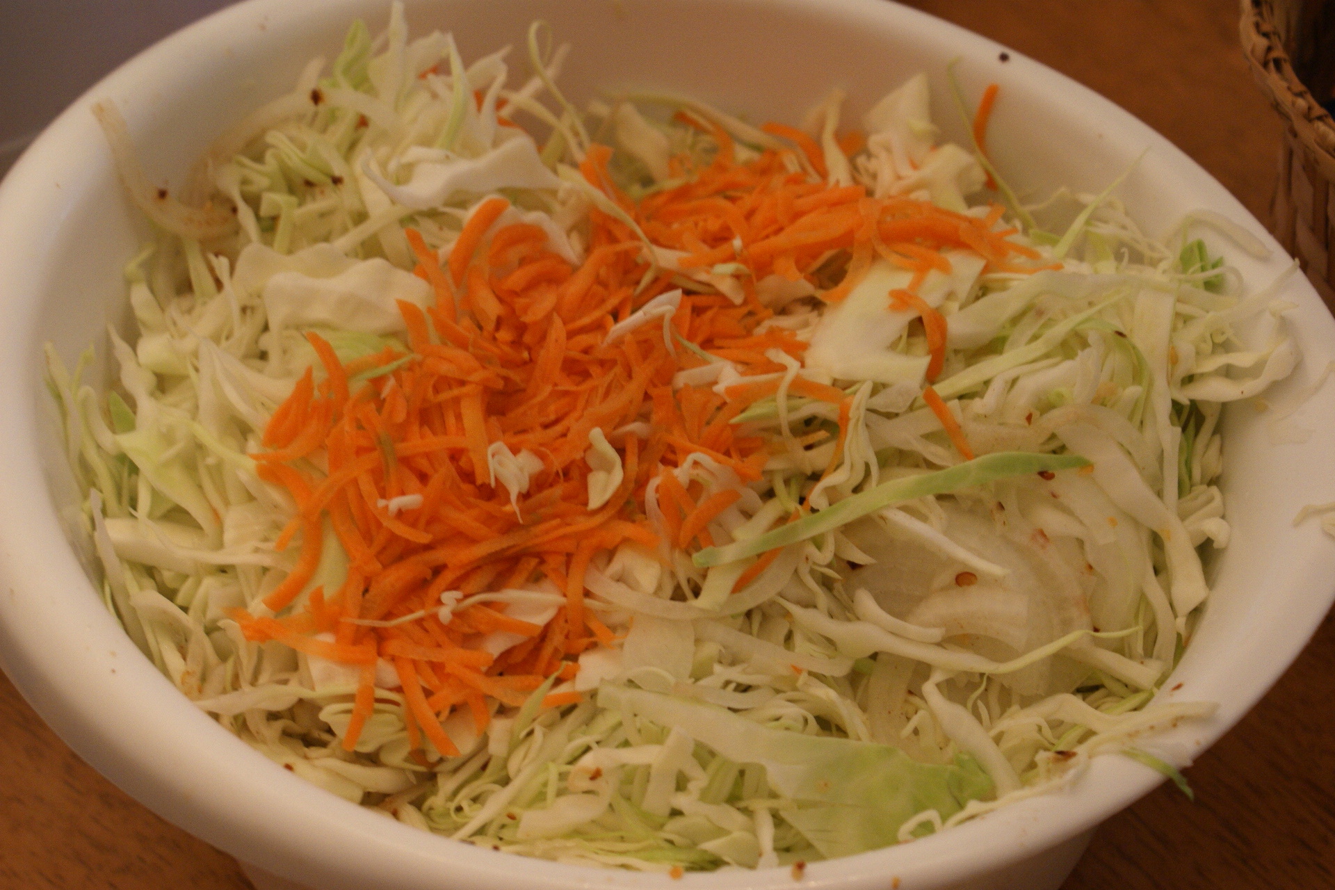 I specifically wanted to try lacto-fermenting kimchi, for a couple reasons. I am curious about the actual traditional way of doing things, and I am starting to believe all the hype about the probiotic power of fermented foods, so lacto-fermentation is something I’d like to play with. Conveniently I am experimenting with cheese a lot these days, so I am left with with plenty of whey. (I don’t even know how to start telling you about the cheese stuff. Another day.) Second, the last Korean restaurant in the area closed last year, and I want me some bibimbop. Third, kimchi makes my husband happy.