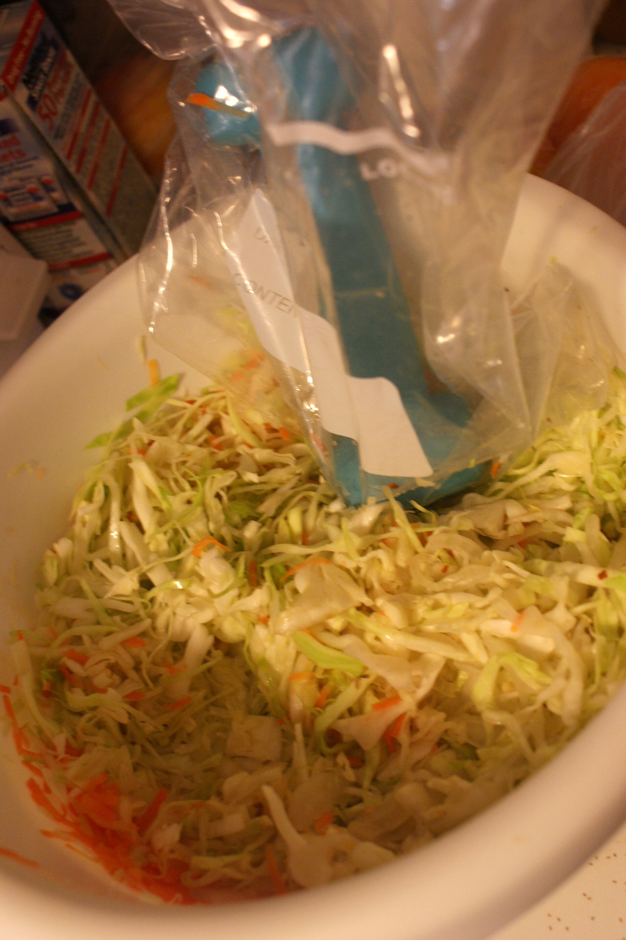 Mashing up a whole head of shredded cabbage with my improvised pounder (a 3-lb weight wrapped in a plastic bag) was very therapeutic. And I couldn’t believe that just pounding the heck out of it, plus adding a tiny bit of whey, produced enough liquid to cover the cabbage. Amazing.