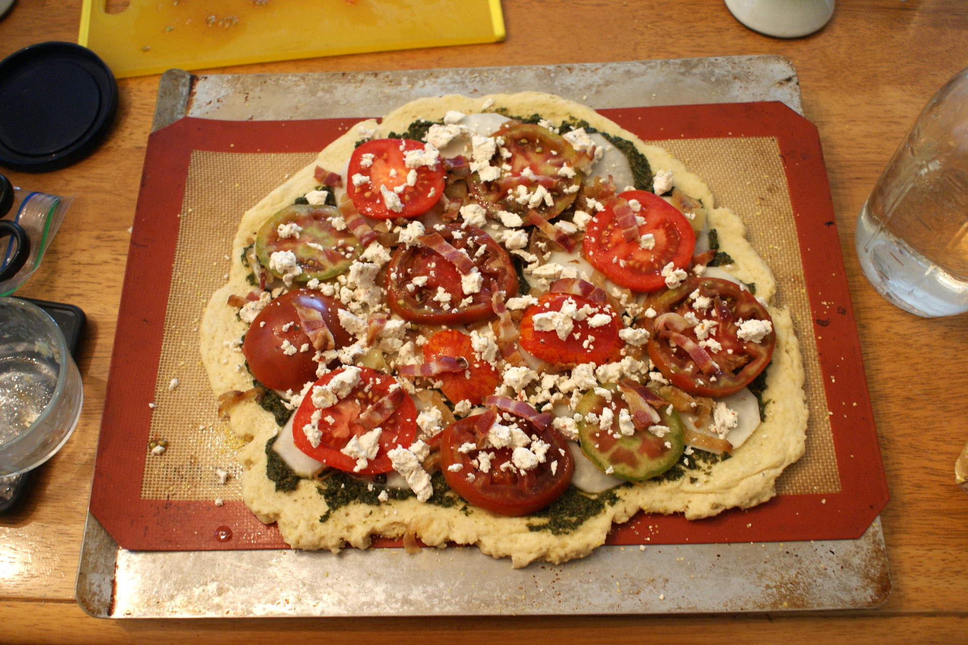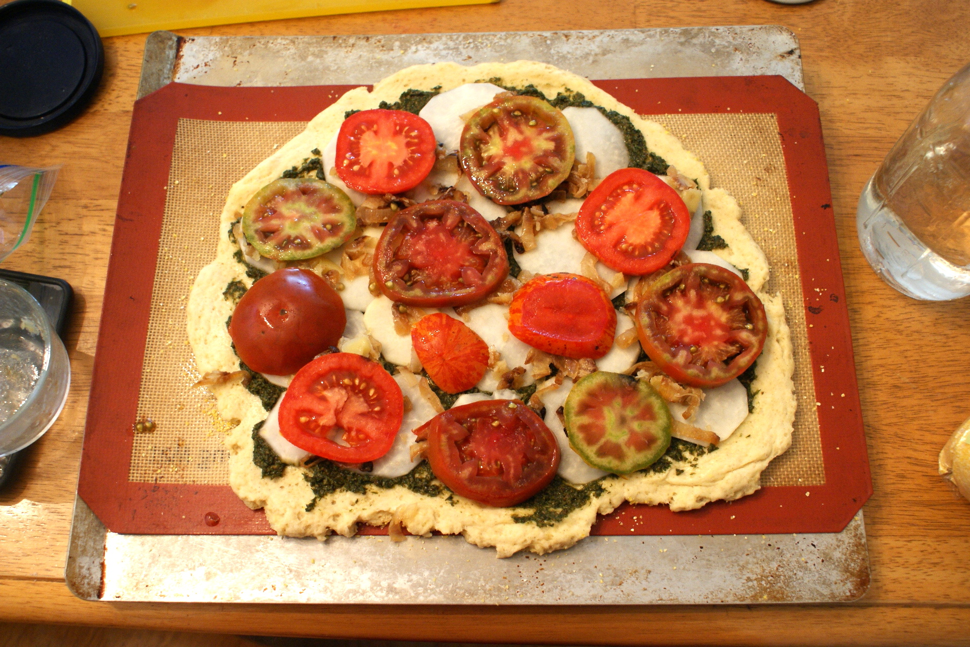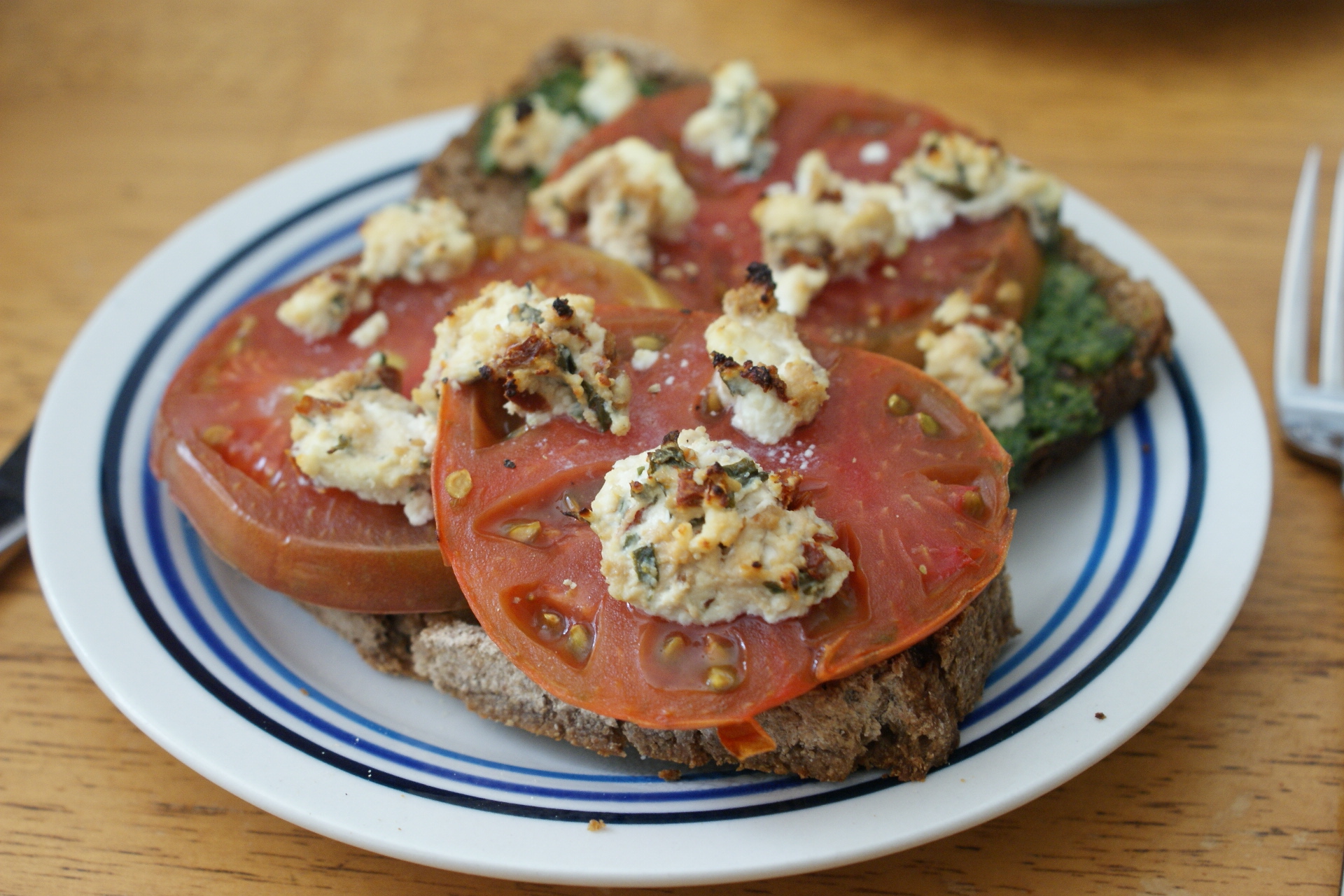Speaking of sourdough, just for kicks and giggles, I had a bunch of heirloom tomatoes still left, desperate to be used up, so the next day I made little mini-pizzas on thin slices of my sourdough bread. Just bread, butter, pesto, tomato, and tomato-basil kefir cheese. Which, you know, you always have just lying around.