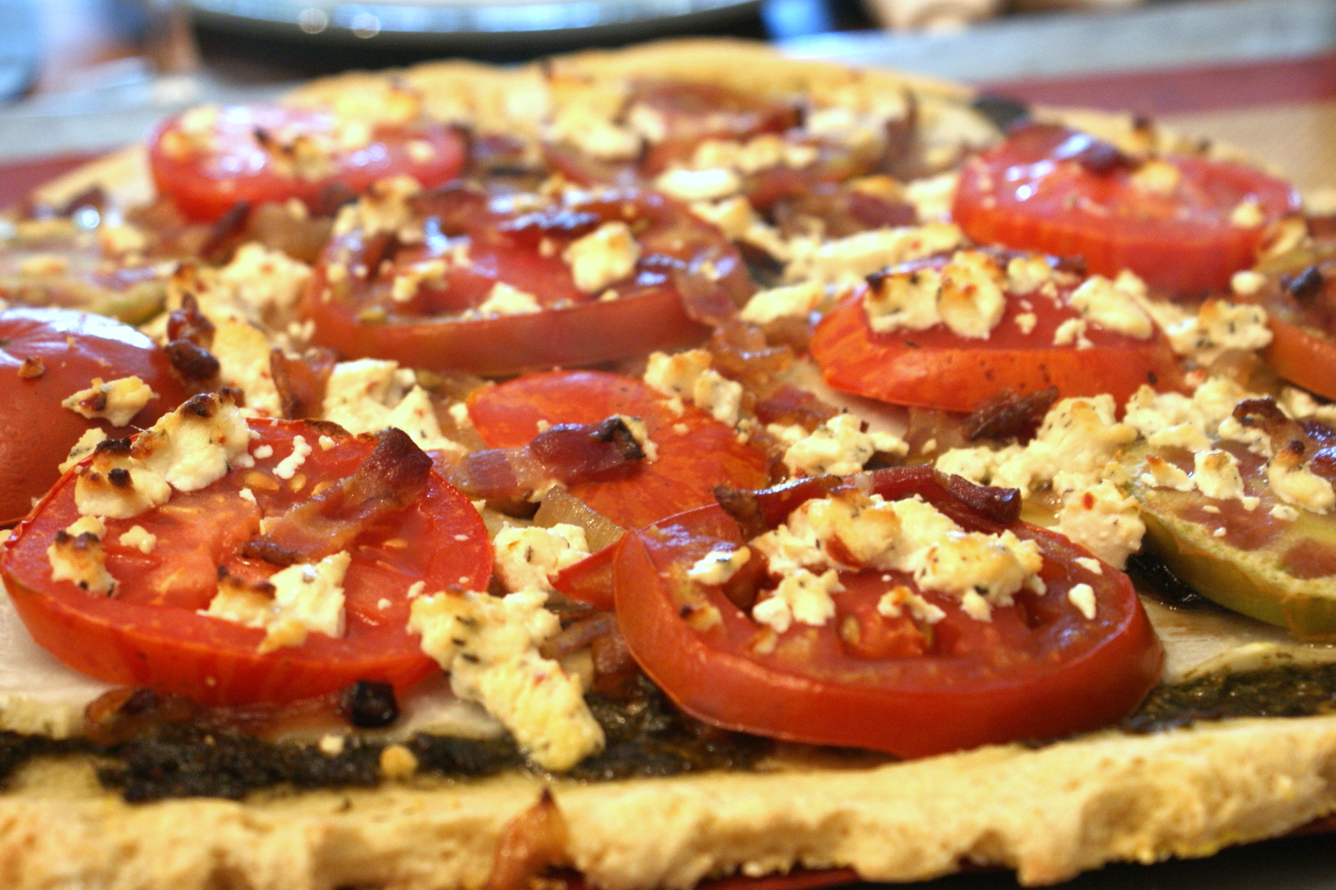 with a sprinkle of tomato-basil goat cheese and a snipped-up piece of bacon.