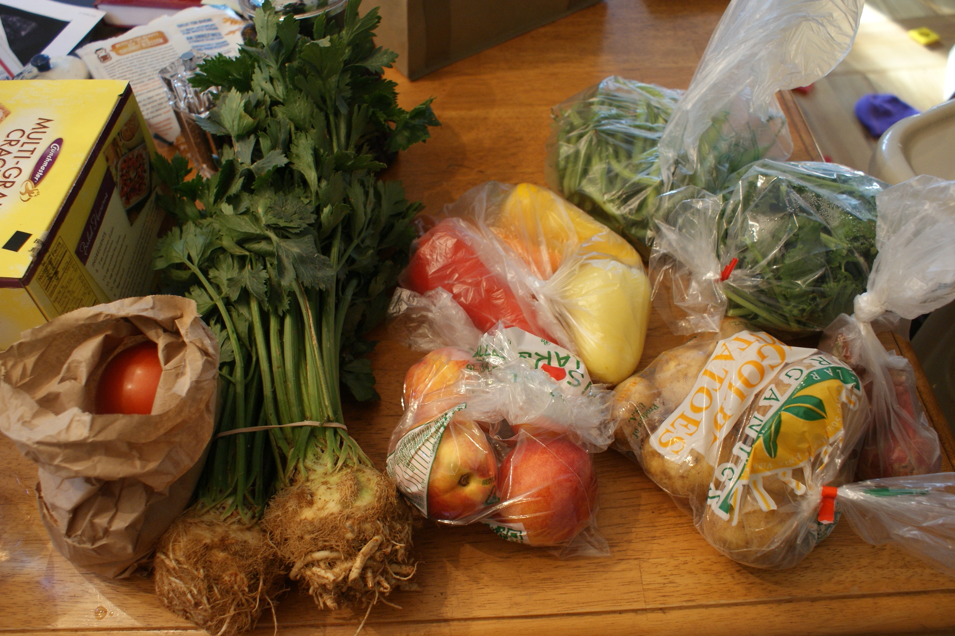 - sweet peppers: the little guys I just ate right out of the bag, but the two big greens sat around for a long time. It’s actually only today that they have finally gotten some attention. Stay tuned.